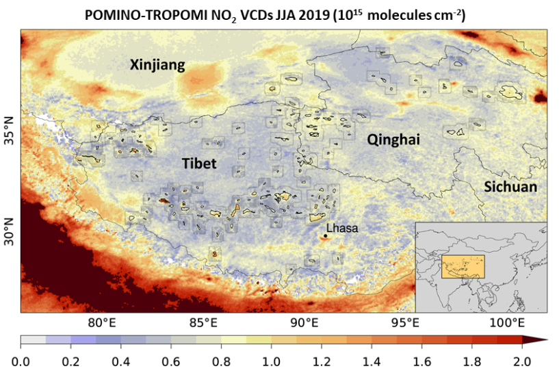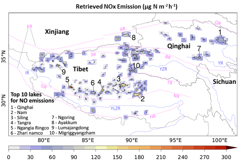 In this Nature Geoscience study, the research team further improved the PHLET algorithm and applied it to their satellite NO2 data product, POMINO-TROPOMI, to achieve high-resolution retrieval of NOx emissions from lakes on the Tibetan Plateau (Fig. 1). Their results show that in summer 2019, the total NOx emissions from 135 lakes larger than 50 km2 with little local human influences reached 1.89 ± 0.54 Ton N h-1, similar to the total anthropogenic emissions in the Tibetan Autonomous Region in current inventories and comparable to anthropogenic emissions from individual megacities. The 135-lake average emission intensity reached 63.4 μg N m-2 h-1, exceeding the intensity in the agricultural fields of China. Based on the spatiotemporal variations of NO2 columns and NOx emissions, together with the environmental and lake water characteristics of the plateau, the study determined that the NOx emissions are originated from natural microbial processes, such as nitrification-denitrification and anaerobic ammonia oxidation. However, current information is insufficient to concretely determine the exact microbial mechanisms. These high NOx emissions are associated with rapid warming and lake changes on the Tibetan Plateau, pointing to previously unknown feedbacks between climate change, lake ecology and nitrogen emissions.