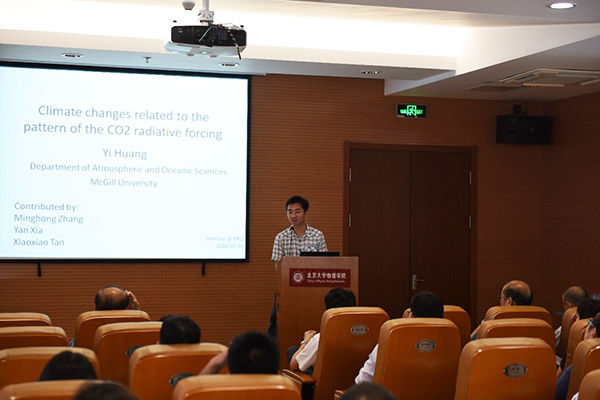 On July 31, 2016, our department successfully held the Peking University International Workshop on Climate and Environmental Change. It is well-known that climate and environmental change is one of the most difficult challenges faced by China and the world. However, mitigation of this problem is limited by our understanding and modeling of the complex physical and chemical processes involved. To boost research progress in the areas of climate and environmental change, this international workshop invited dozens of scientists in China and abroad to discuss research challenges and future prospects in an interdisciplinary scene. Topics of discussion included earth and planetary climate, climate change, atmospheric environmental change, and attribution and mitigation. The workshop was kindly supported by many alumni and colleagues. Of the 15 invited speakers, 14 were from outside the department and 11 were from overseas. The workshop welcomed attendees including 21 from outside Peking University. It provided a nice environment for interdisciplinary discussion and exchange, with supports from enlightening talks and Q&A.