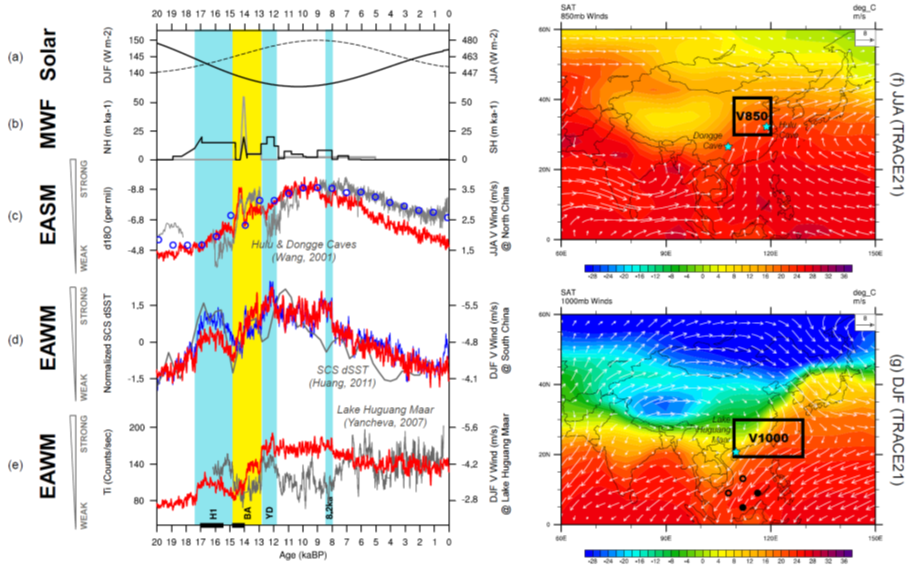 Figure. Variability of EASM, EAWM, and associated climatic variables in the past 20,000 years. (a) Solar insolation at 45N; (b) Fresh water fluxes in NH and SH; (c) Observed EASM index (Wang, et al., 2001, grey), Simulated EASM index (red, definition see f), and Simulated d18O (blue circle); (d) Observed EAWM index (Huang, et al., 2011, grey), Simulated SST gradient index (blue), Simulated EAWM index (red, definition see g); (e) Observed EAWM index (Yancheva, et al., 2007, grey) and Simulated EAWM index followed Yancheva et al. (2007) (red); (f) Climatology of EASM in model; (g) Climatology of EAWM in model.