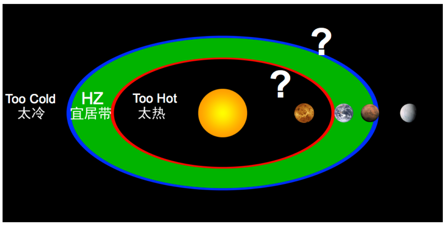 Figure caption: Habitable zone (HZ) concept. Where is the inner edge of the HZ? Where is the outer edge of the HZ? What determines the width of the HZ?