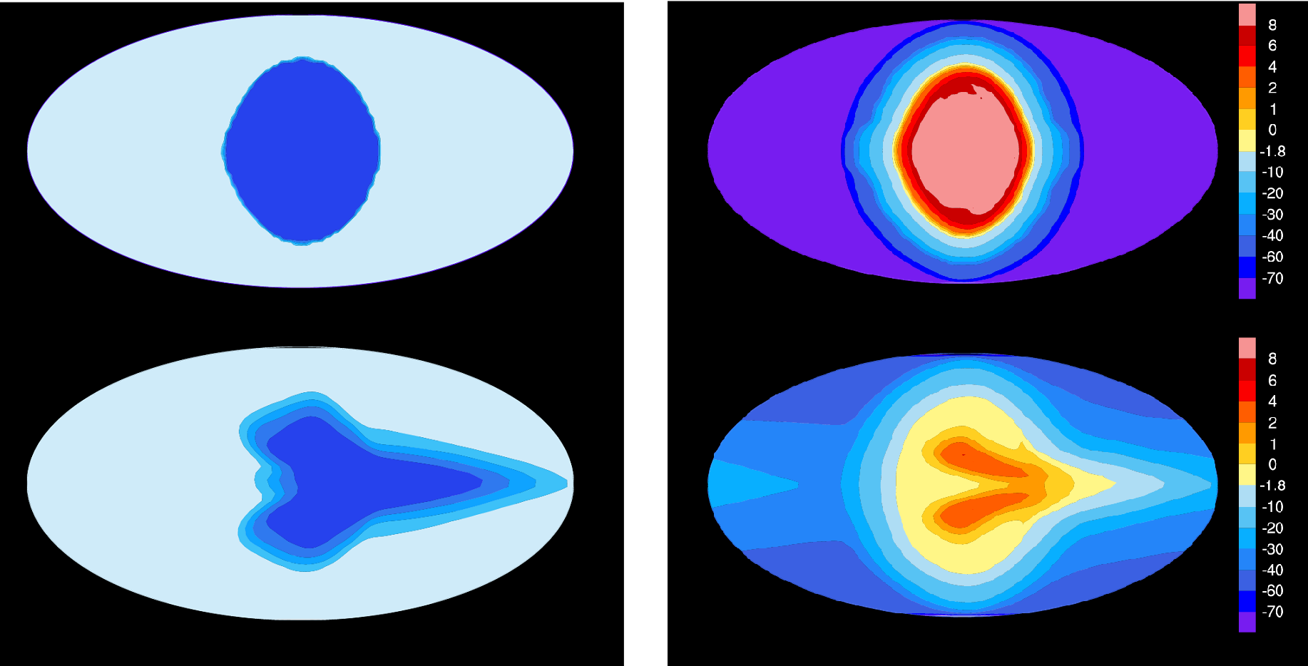 Figure caption: Simulated climate of tidally locked aqua-planets orbiting around low-mass stars. Left panels: sea ice (white) and ocean (blue). Right panels: surface air temperature (^oC). Upper row: atmosphere-only without ocean heat transport. Lower row: coupled atmosphere-ocean simulation.