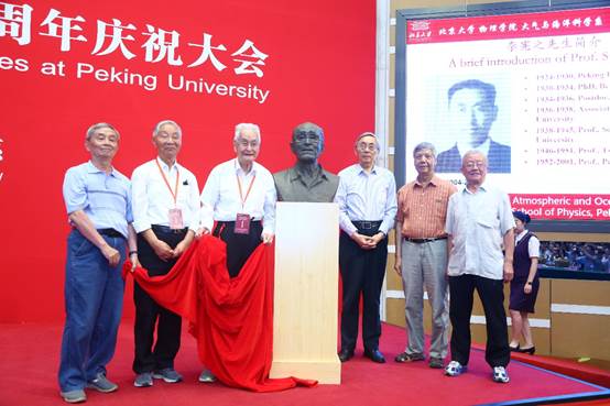 在90年历史中,是一代又一代的教师们不懈的坚持和守望使北大大气学科从弱小走向强盛,他们传递给学生们的不仅是科学知识,还有他们严谨治学、淡泊明志、为人师表的高尚人格。李宪之先生就是这样一位受人敬仰的老师,他与北大大气学科相伴了长达65年。在迎接北大大气学科90华诞之际,大气与海洋科学系决定为其树立铜像,以感谢他对学科发展和建设所做出的卓越贡献。校友丑纪范院士、吕达仁院士、丁一汇院士和大气与海洋科学系刘式达、秦瑜、黄嘉佑三位教授为李宪之铜像揭幕。