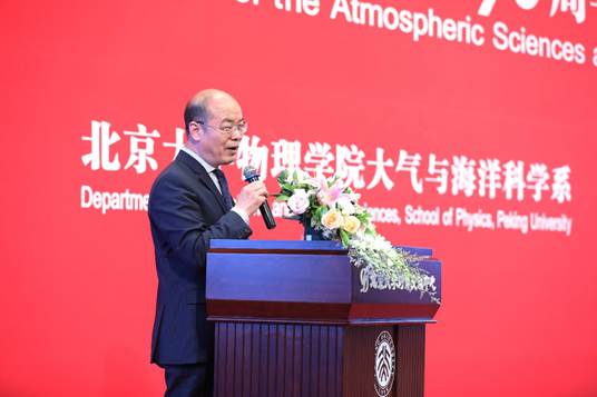 随后,北京大学副校长龚旗煌院士代表北京大学向与会嘉宾、大气科学学科的前辈、海内外校友和师生员工表示热烈的祝贺和诚挚的问候,向长期以来关心、支持北大大气科学学科发展的各兄弟单位和各界人士表达敬意与感谢。他指出,90年来,北大大气学科始终是我国大气科学界的学术重镇,在人才培养、科学研究、社会服务等方面做出了杰出贡献,特别指出了大气学科曾获得15项国家级奖项、培养了20位两院院士、在第四轮学科评估中获得A+。龚旗煌副校长表示,北大将继续支持大气学科发展,并期待大气与海洋科学系继续吸引青年才俊,加强创新研究,努力建设世界一流的教师队伍,培养学科人才,服务国家需求,为世界大气科学事业做贡献。