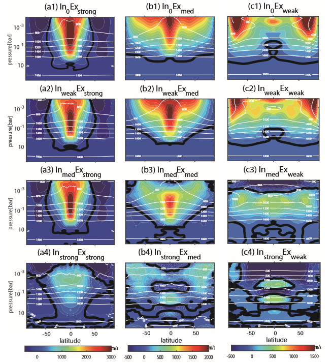 Figure 1. Zonal-mean zonal wind for various external and internal forcings. The abbreviates are like: InmedExweak means medium internal forcing with weak external forcing, etc.