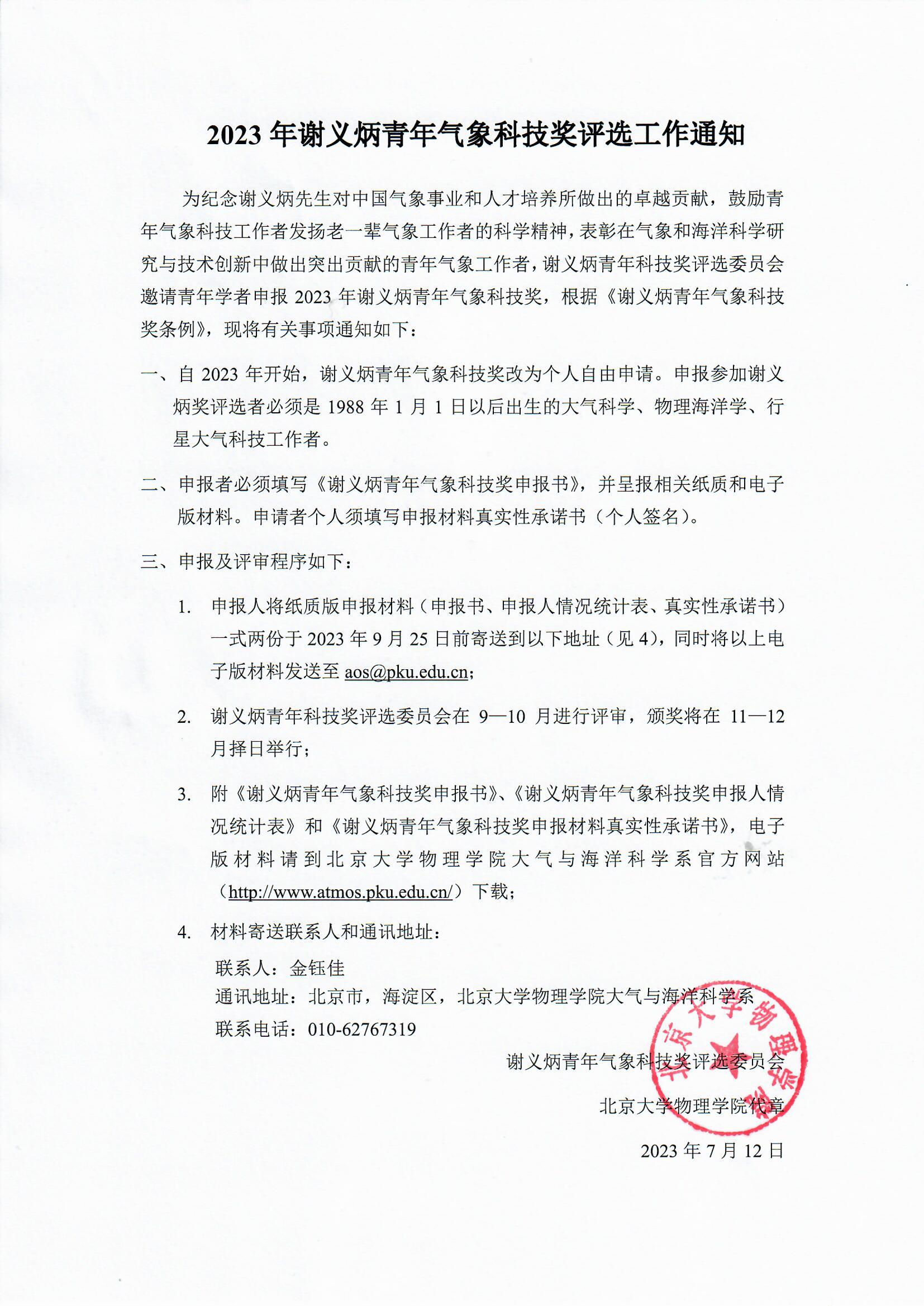 一、自2023年开始,谢义炳青年气象科技奖改为个人自由申请。申报参加谢义炳奖评选者必须是1988年1月1日以后出生的大气科学、物理海洋学、行星大气科技工作者。
