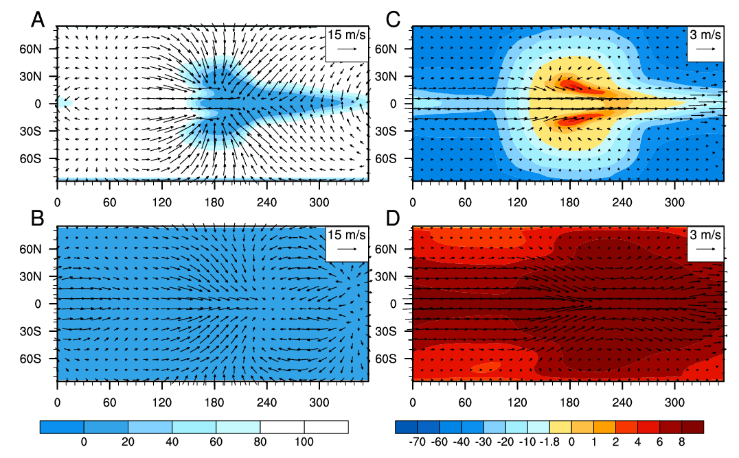 Figure caption:Spatial distributions of sea-ice fraction and surface air temperature. Left panels: sea-ice fraction, unit: %, and right panels: surface air temperature, unit: oC. Upper panels: 355 ppmv CO2, and lower panels: 200,000 ppmv CO2. In plots A and B, arrows indicate wind velocity at the lowest level of the atmospheric model (990 hPa), with a length scale of 15 m s-1. In plots C and D, arrows indicate ocean surface current velocity, with a length scale of 3 m s-1. Note that the color scale for surface air temperature is not linear. The substellar point is at the equator and 180o in longtitude.