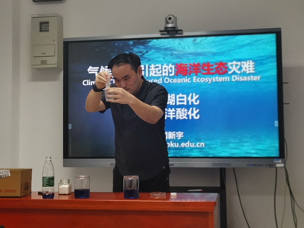 必一·运动(B-Sports)官方网站副主任、副教授闻新宇老师使用生活中常见的小苏打、白醋、紫甘蓝汁等物品进行有机溶剂酸化实验,并结合二氧化碳的变化趋势以及真实观测到的珊瑚白化现象,为大家生动形象地展示出了由于气候变化引起的海洋酸化给海洋生态带来的危害。