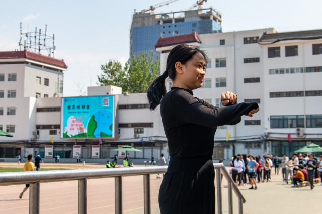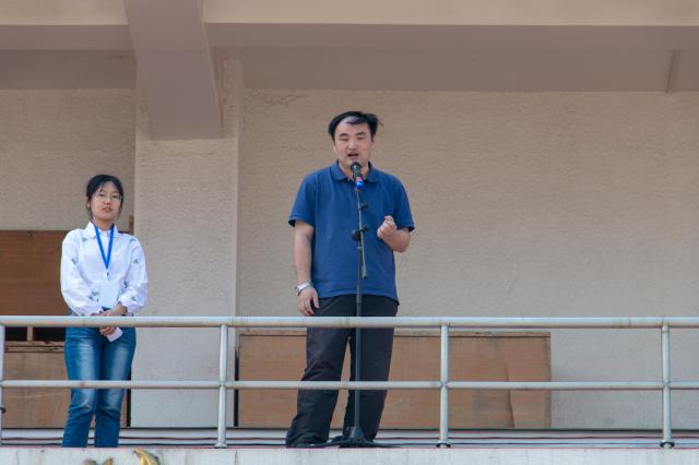 13:30,主持人张璐同学宣布活动开始,姜中景同学带领参加活动的师生进行跑步热身准备活动。