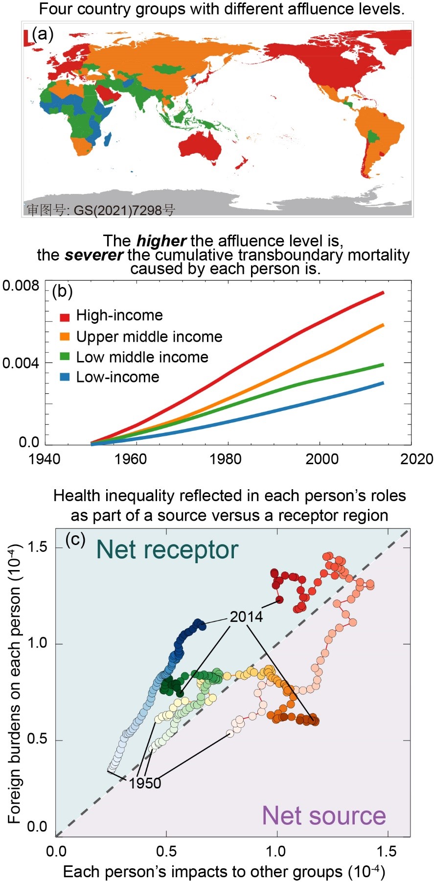 本研究针对1950年以来全球排放、污染和人口的剧烈变化,定量了1950-2014年间不同富裕程度的地区的人为源排放所造成的跨界PM2.5相关过早死亡,并揭示了跨界污染健康影响的不平等性问题。本研究依据全球不同国家的富裕程度,将其划分为高收入组、中高收入组、中低收入组和低收入组(图1a),并结合全球大气化学传输模式、污染暴露模式、卫星反演地表PM2.5数据和人为源排放清单,定量了跨界污染健康影响。