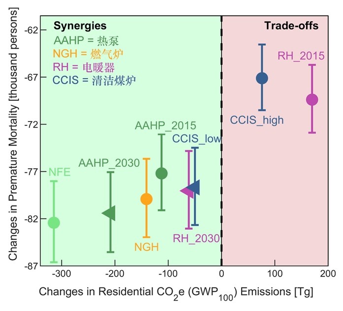 图1 我国北方地区不同清洁取暖替代情景相较2015年基准情况的PM2.5健康效应(纵轴)和二氧化碳当量排放(横轴)的协同效应或权衡效应,其中考虑的清洁取暖情景包括清洁煤炉-低排放因子(CCIS_low)、清洁煤炉-高排放因子(CCIS_high)、燃气炉(NGH)、电暖器-2015电力结构(RH_2015)、电暖器-2030电力结构(RH_2030)、热泵-2015电力结构(AAHP_2015)、热泵-2030电力结构(AAHP_2030)以及热泵-非化石能源发电(NFE)