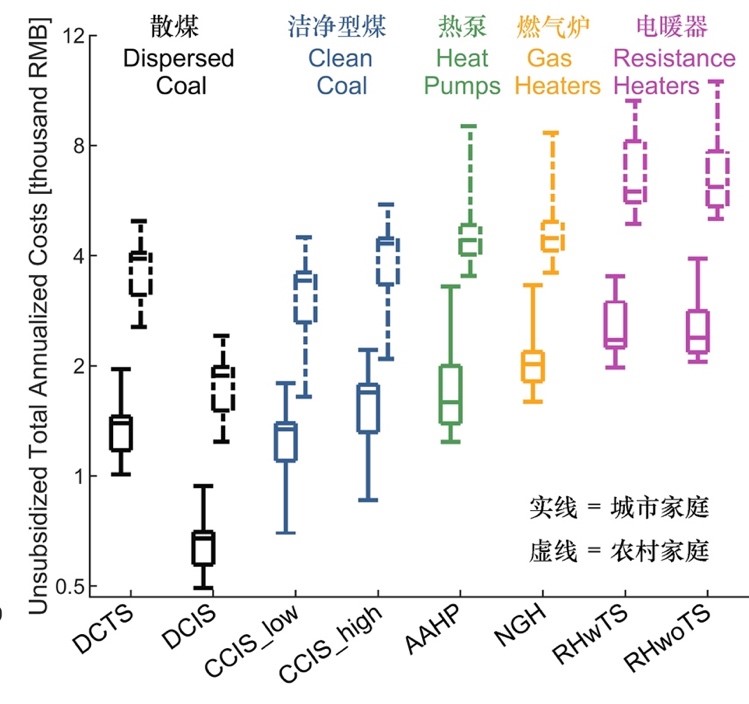 图2 我国北方地区典型城镇(实线)和农村(虚线)家庭采用不同取暖设备的年化总成本(即年化设备成本与年均运行成本之和;未考虑补贴政策),图中比较的取暖设备包括散煤与传统炉(DCTS)、散煤与节能环保炉(DCIS)、清洁煤炉-低排放因子(CCIS_low)、清洁煤炉-高排放因子(CCIS_high)、燃气炉(NGH)、热泵(AAHP)、直热式电暖器(RHwoTS)和蓄热式电暖器(RHwTS)