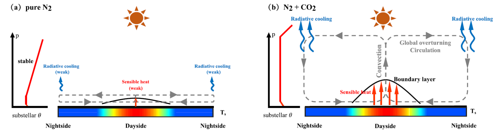 我们的研究揭示在干燥的潮汐锁相岩石行星上,CO2(或其他温室气体)的辐射冷却效应代替了湿大气中的潜热释放的作用,驱动了大气翻转环流。