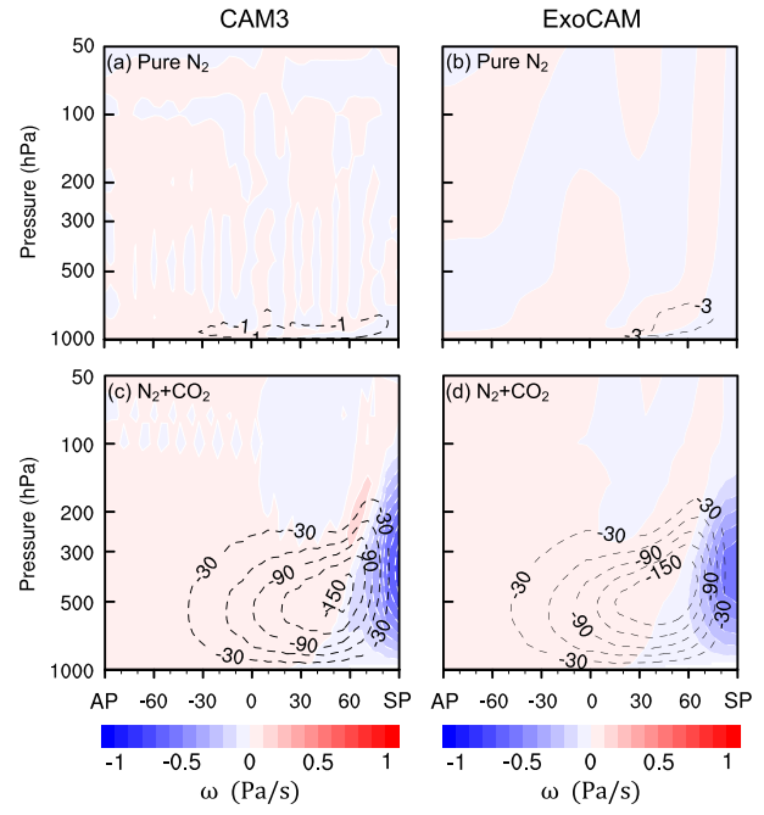 图4:纯N2和N2+CO2情况下的大气翻转环流(流函数,等值线)以及垂直速度(填充色)的对比。左边是CAM3的模拟结果,右边是ExoCAM模拟的结果。
