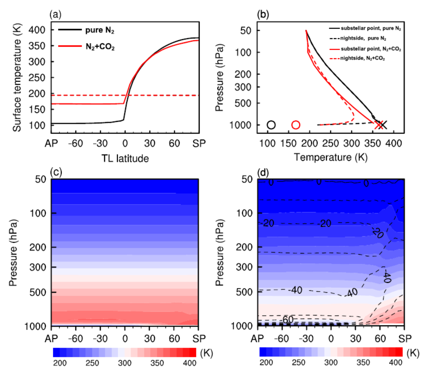图3:纯N2和N2+CO2情况下的地表温度和大气温度结构的对比。(a)地表温度;(b)星下点和背阳面的温度垂直结构;(c)纯N2大气的温度结构;(d)N2+CO2大气的温度结构,等值线表示与图(c)中的差值,虚线为负值。