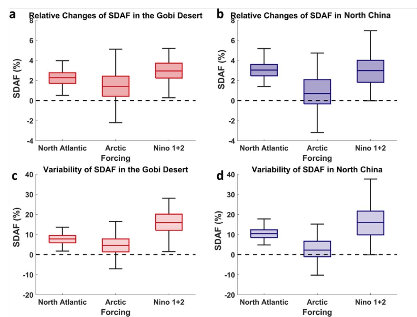 图3 北大西洋海温(℃)增加1%、北极海冰浓度(%)减少1%和Niño 1+2区海温(℃)减少1%对 (a) 戈壁沙漠和 (b) 华北地区春季沙尘活动频率的贡献;北大西洋海温(℃)、北极海冰浓度(%)和Niño 1+2区海温的气候变率(用年时间序列的标准差代表)对 (c) 戈壁沙漠和 (d) 华北地区春季沙尘活动频率的贡献。黑色虚线代表SDAF=0,所有春季沙尘活动频率的变换均通过p<0.1的Student t-检验。