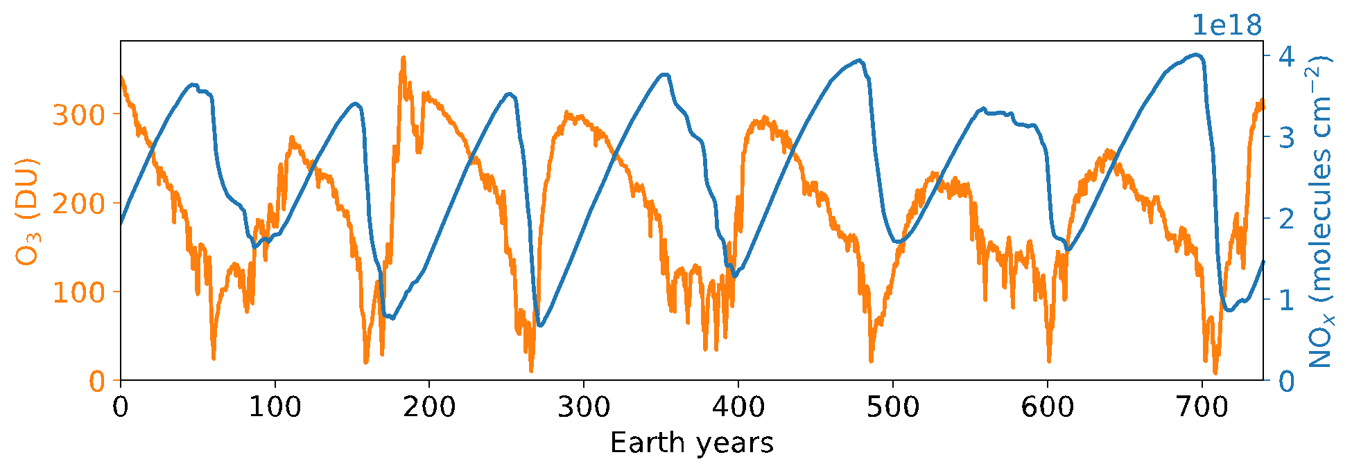 使用光化学、辐射和大气动力全耦合的三维大气环流模式,胡永云等开展了系列模拟试验,发现在恒星辐射和行星表面氮氧化物排放速率保持不变的条件下,大气中臭氧浓度存在近百年的准周期振荡,其最低臭氧浓度可降至最高浓度的百分之三(图1),与臭氧化学反应相关的氮氧化物(NOx)、氢氧根(OH)和硝酸(HNO3)也呈现周期性振荡。