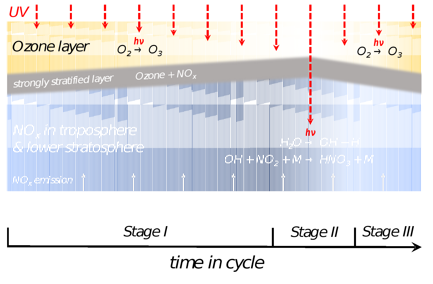 图2给出的是辐射-光化学-热力-动力相互耦合并形成臭氧振荡的示意图。在红矮星紫外辐射的作用下,氧气光解在大气平流层形成臭氧层。与此同时,行星表面排放的NOx不断在大气中累积。臭氧吸收紫外辐射形成逆温层,并在臭氧层底部形成稳定的热力层结(灰色区域)。行星表面排放的NOx进入该区域,不断地消耗臭氧,导致该稳定层结区向上移动,更多地消耗臭氧(Stage I),直至该稳定层结被破坏,绝大部分臭氧被消耗(Stage II)。当只有很少臭氧时,紫外辐射可以到达对流层,导致水汽光解形成OH,后者与NO2反应,形成HNO3并沉降出去,导致NOx减少。当大气NOx减少时,臭氧开始恢复(Stage III)。