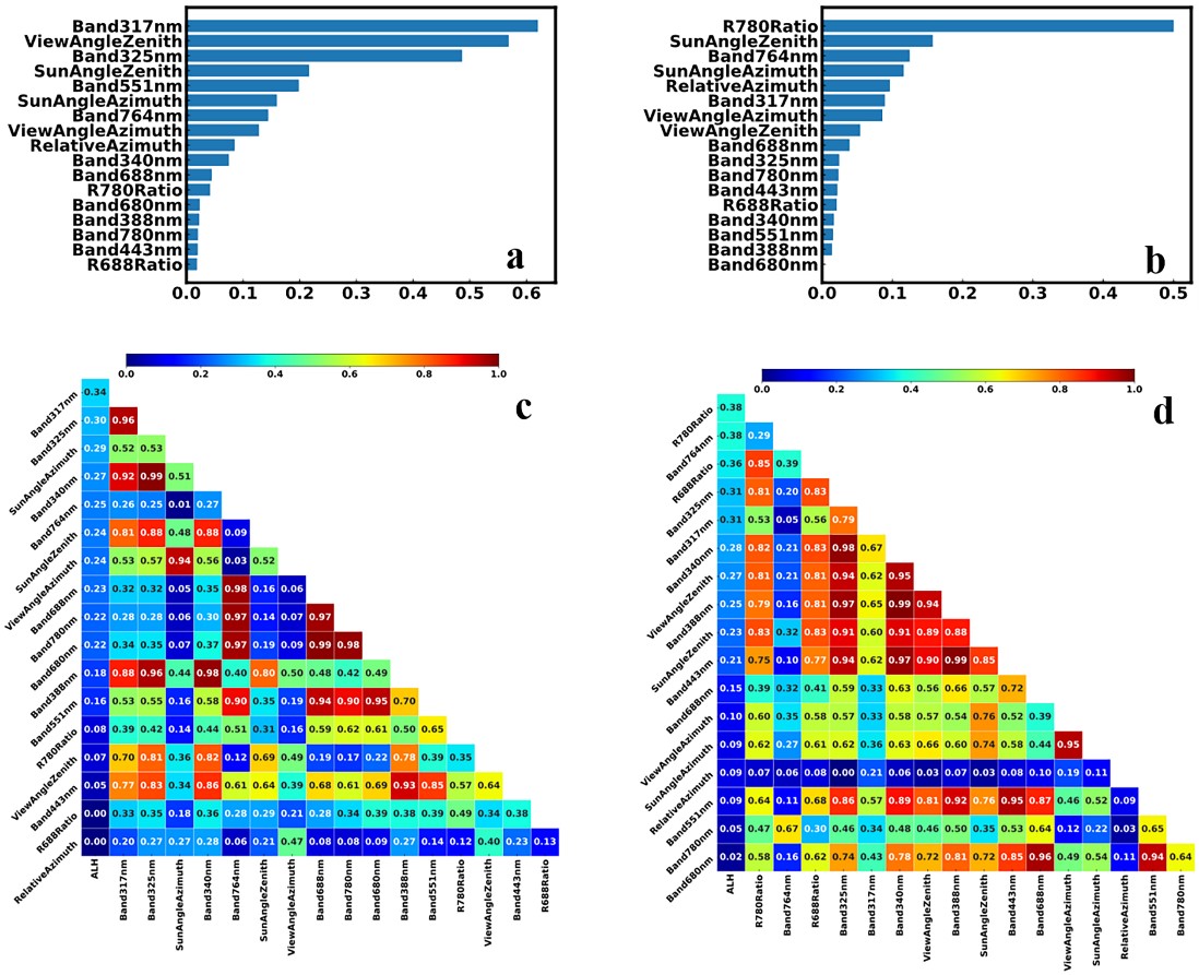 与传统的物理算法相比,机器学习算法可以考虑不同通道对不同气溶胶类型的敏感性差异,自动调整特征权重以优化模型性能。如图2所示,不同区域ALH反演模型的特征重要性排序有很大差异。区域1以沙尘气溶胶为主,317 nm和325 nm紫外波段的表观反射率更为重要,并且与 ALH 表现出很强的相关性。相反,在区域2中,氧气吸收波段(764 nm)的表观反射率以及该波段与 788 nm 之间的反射率比值更为重要。