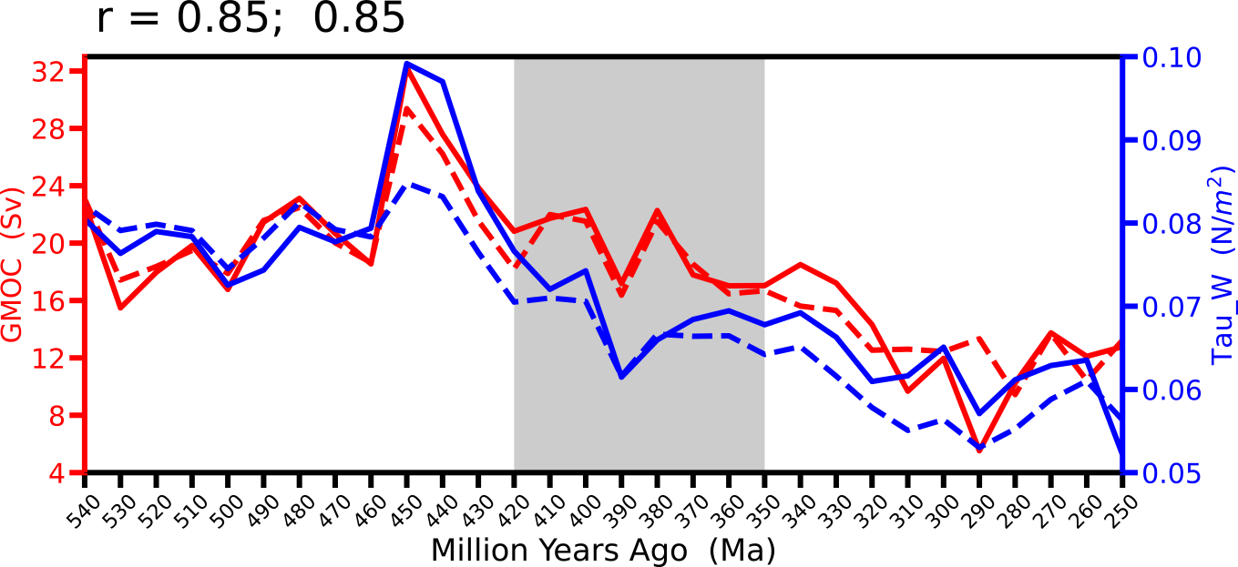 古生代指的是5.41-2.5亿年前这一时期。在古生代早期,大陆主要散布在南半球中高纬度(图1D),后来逐渐聚合,并向北半球移动,在2.5亿年前后形成纵贯南北极的潘吉亚超大陆。古生代海陆分布与现代的差异如此之大,其GMOC的形态和强度与现代的有何差异?随着古生代大陆演化,GMOC如何演变?什么因素主导了GMOC演变?这些是该项研究所关注的科学问题。
