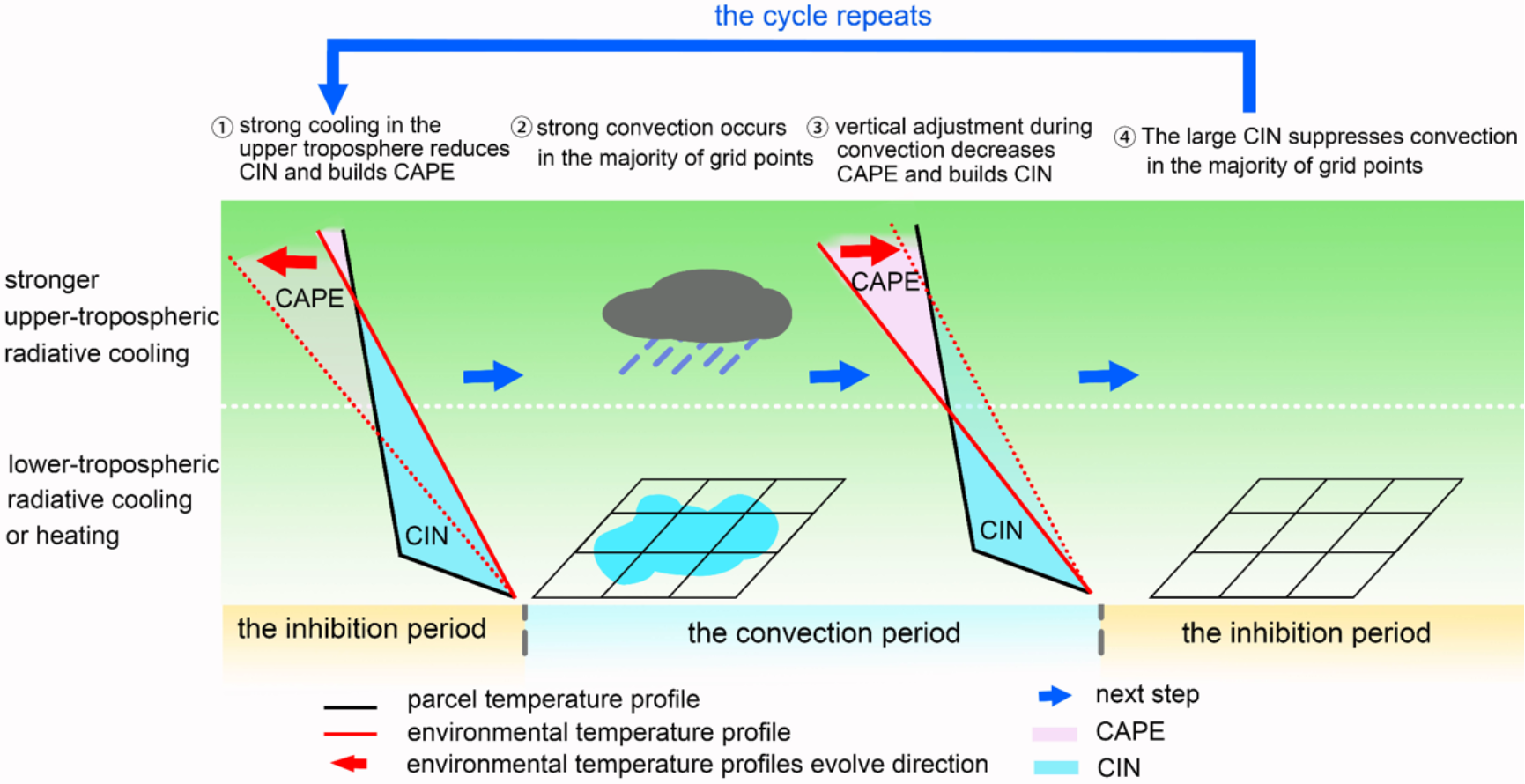辐射加热率的垂直对比度是如何触发间歇性暴雨的?我们提出了一个循环机制,如下图4所示:在降水极少的抑制期,对流层上层的强冷却作用使得环境温度廓线向减温率更大的方向发展,积累对流有效位能(CAPE),削弱对流抑制(CIN);当CIN被削弱到不能再抑制对流时,模式中的大部分格点触发强对流、产生强降水;降水期间的垂直调整使得CAPE在降水结束后变小,CIN在降水结束后增强,从而在绝大部分格点中抑制对流;在抑制期,对流层上层的强冷却继续积累CAPE、削弱CIN,直到触发下一次强对流,如此循环,形成间歇性暴雨。
