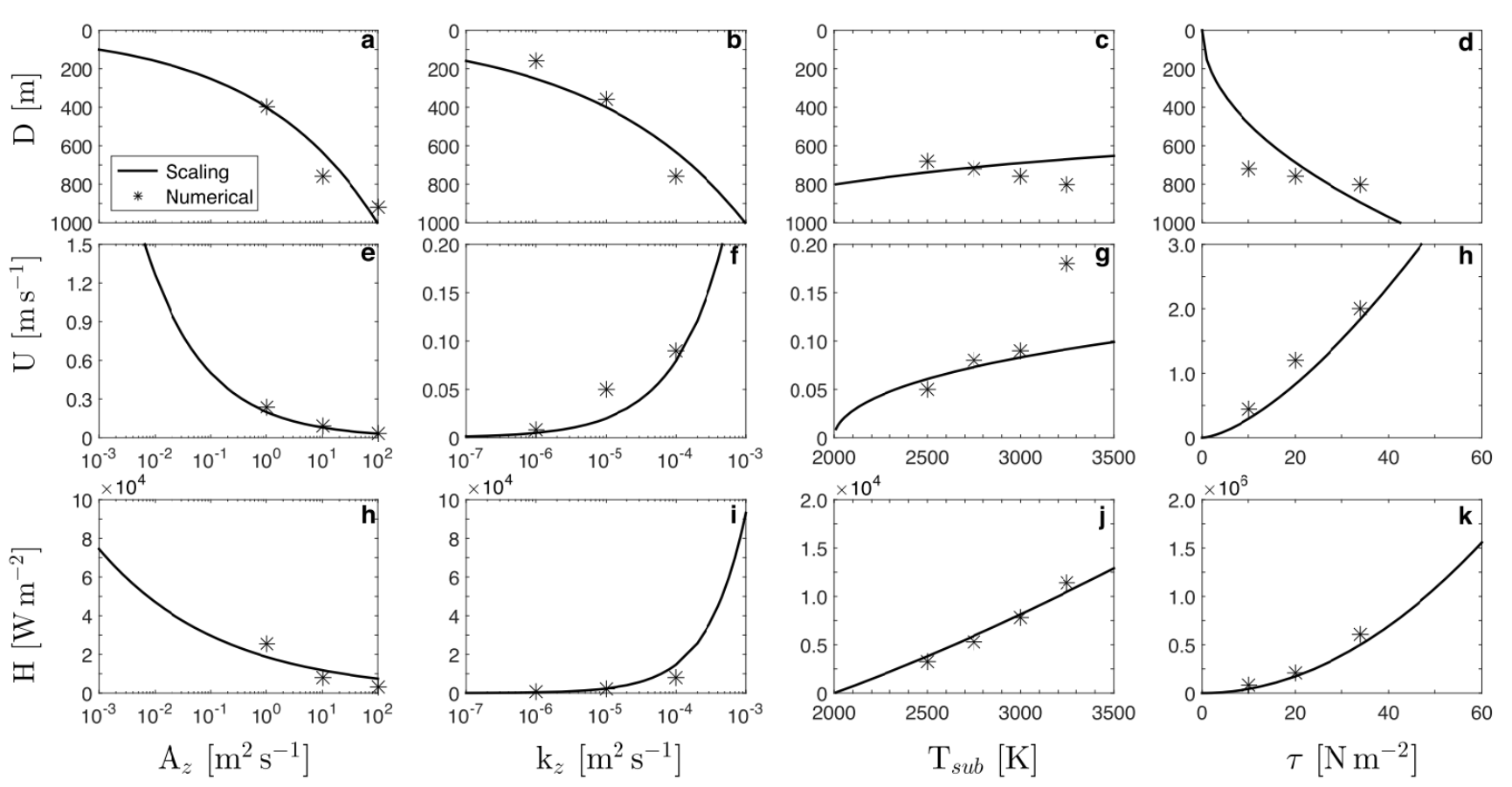不同潮汐锁定熔岩行星的参数及其海洋特征可能存在显著差异。我们通过尺度分析得出了三种不同动力机制下海洋环流强度、熔岩海洋深度及热输送通量的控制因子:黏性主导的机制 I、平流主导的机制 II、旋转主导的机制 III。在这三种机制中,动量方程中的水平压强梯度力分别由垂直黏性、非线性平流及科氏力项平衡。理论结果显示,海洋深度、水平流速及海洋热输送通量由垂直扩散、垂直黏性、行星旋转速率、恒星辐射及风应力决定;熔岩海洋深度始终保持在几百米,与数值模拟结果一致;海洋环流的形态最可能由旋转主导,类似于地球海洋。其中,黏性主导下的理论结果得到了模拟结果的验证(图4)。
