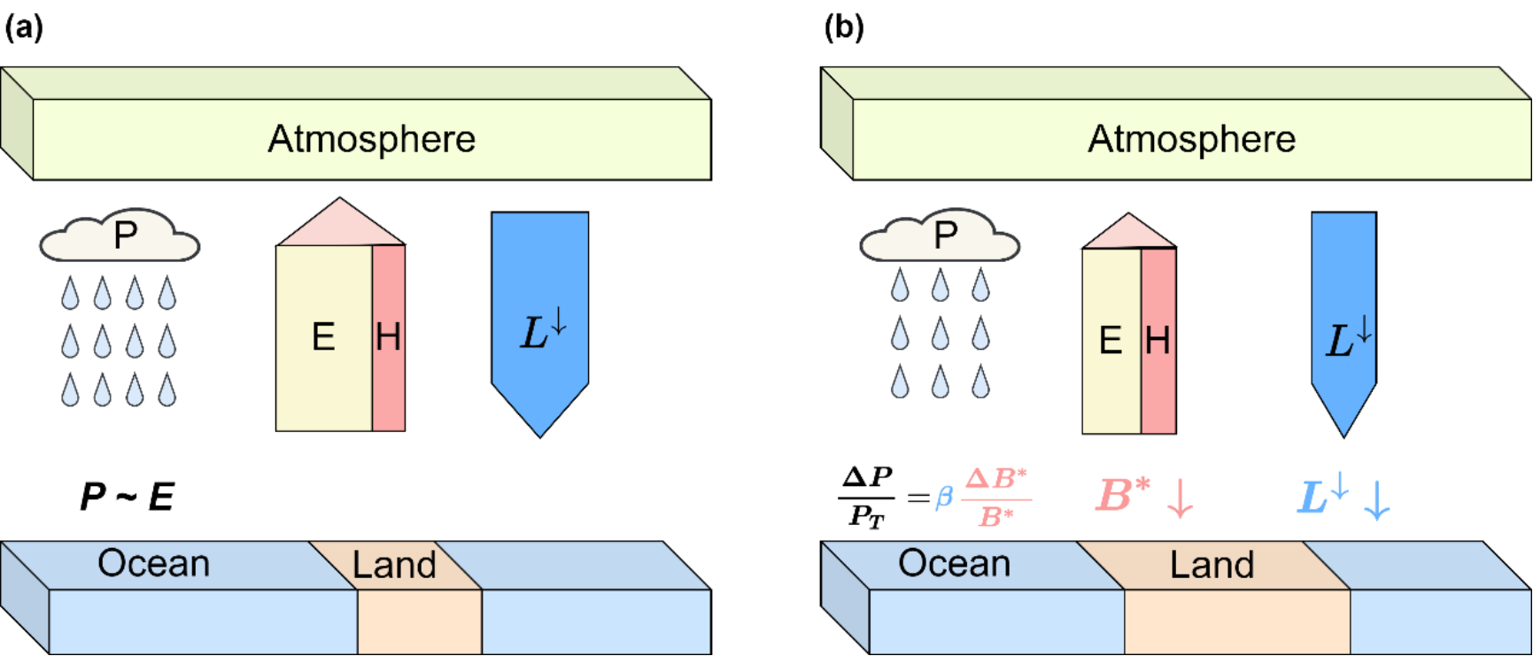 我们该研究进一步揭示了陆地覆盖率如何通过影响大气能量平衡机制来影响水循环(图2)。相比海洋,陆地的潜热通量较低,陆地覆盖率的增加会改变全球感热与潜热通量的相对比例,从而直接减少GMP。此外,潜热通量降低导致大气变干,削弱水汽的温室气体效应,从而进一步将直接效应的影响放大了约44%。