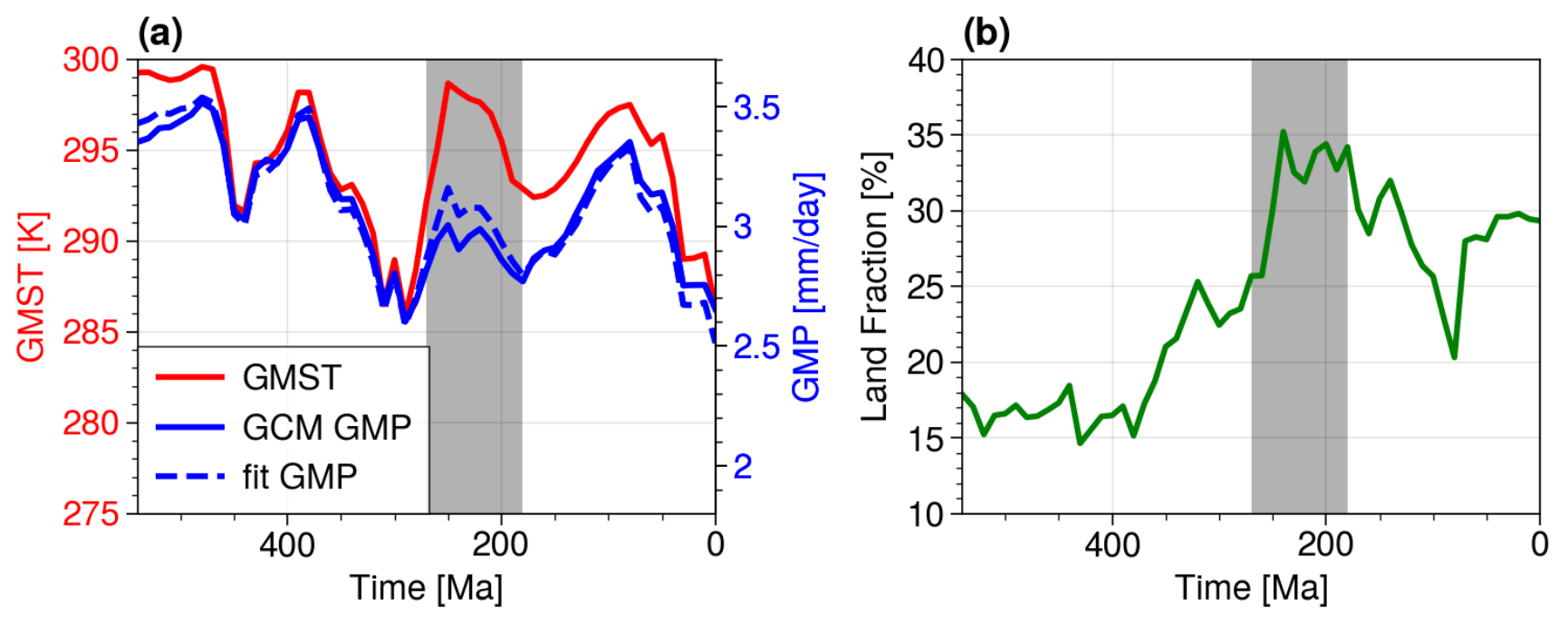我们基于这些机制,研究团队构建了一个简单模型,将GMP表示为全球平均温度和陆地覆盖率的函数,并成功再现了古气候模拟的结果(图1a)。此模型表达式为: