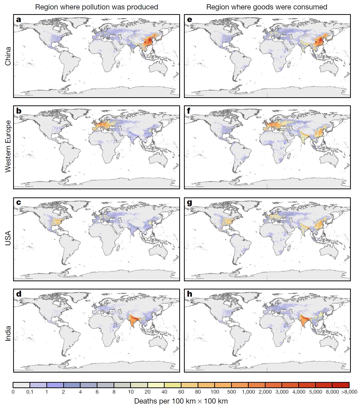 图1:中国、西欧、美国、印度的生产(左)和消费(右)引起的排放-污染-大气输送导致的细颗粒物相关过早死亡人数的空间分布。来源:Zhang et al., 2017, Nature。