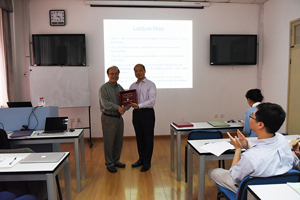 2016年5月9-13日,必一·运动(B-Sports)官方网站成功举办了第十二次《大气与海洋科学特邀系列报告》(Distinguished Lectures in Atmospheric and Oceanic Sciences),世界著名气象学家、马里兰大学地球系统科学交叉研究中心高级研究员和马里兰大学兼职教授William K. M. Lau(刘家铭)应邀作了为期一周的系列学术报告。在系列报告开始前,物理学院副院长、大气与海洋科学系系主任胡永云教授为刘家铭教授颁发了北京大学“客座教授”荣誉证书和“大气与海洋科学特邀系列报告”纪念奖牌。