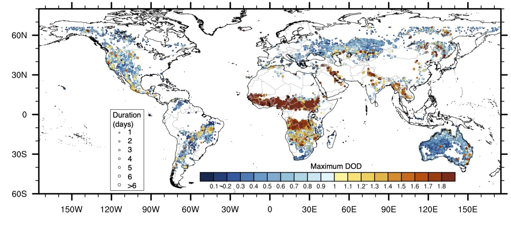 图1全球野火后沙尘排放导致的最大沙尘气溶胶光学厚度(点的颜色)和单次燃烧事件后沙尘排放最长持续天数(点的大小)