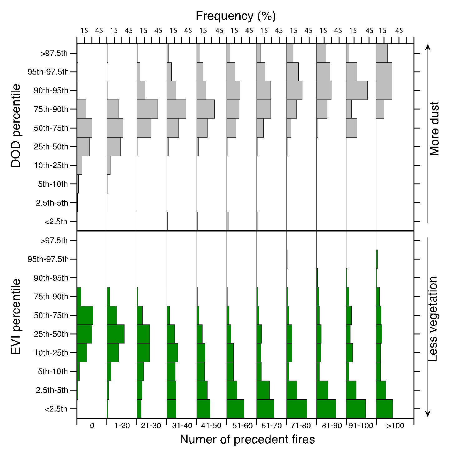 野火是发生在自然植被类型上的生物质燃烧现象,是陆地生态系统的主要扰动源和天然气溶胶的主要自然排放源之一,影响全球碳循环、气候和经济社会。理论上说,野火破坏植被导致裸土面积增加,进而降低地表粗糙度和空气动力学阻力导致近地面风速上升,同时野火燃烧有机质降低土壤粘结力和土壤湿度。以上结果造成野火后有利于沙尘排放的陆面和大气条件。前人利用地面观测资料在北美捕捉到野火后沙尘排放的现象;全球其他地方是否也有这样的现象?野火后沙尘排放的强度和频率有多高?