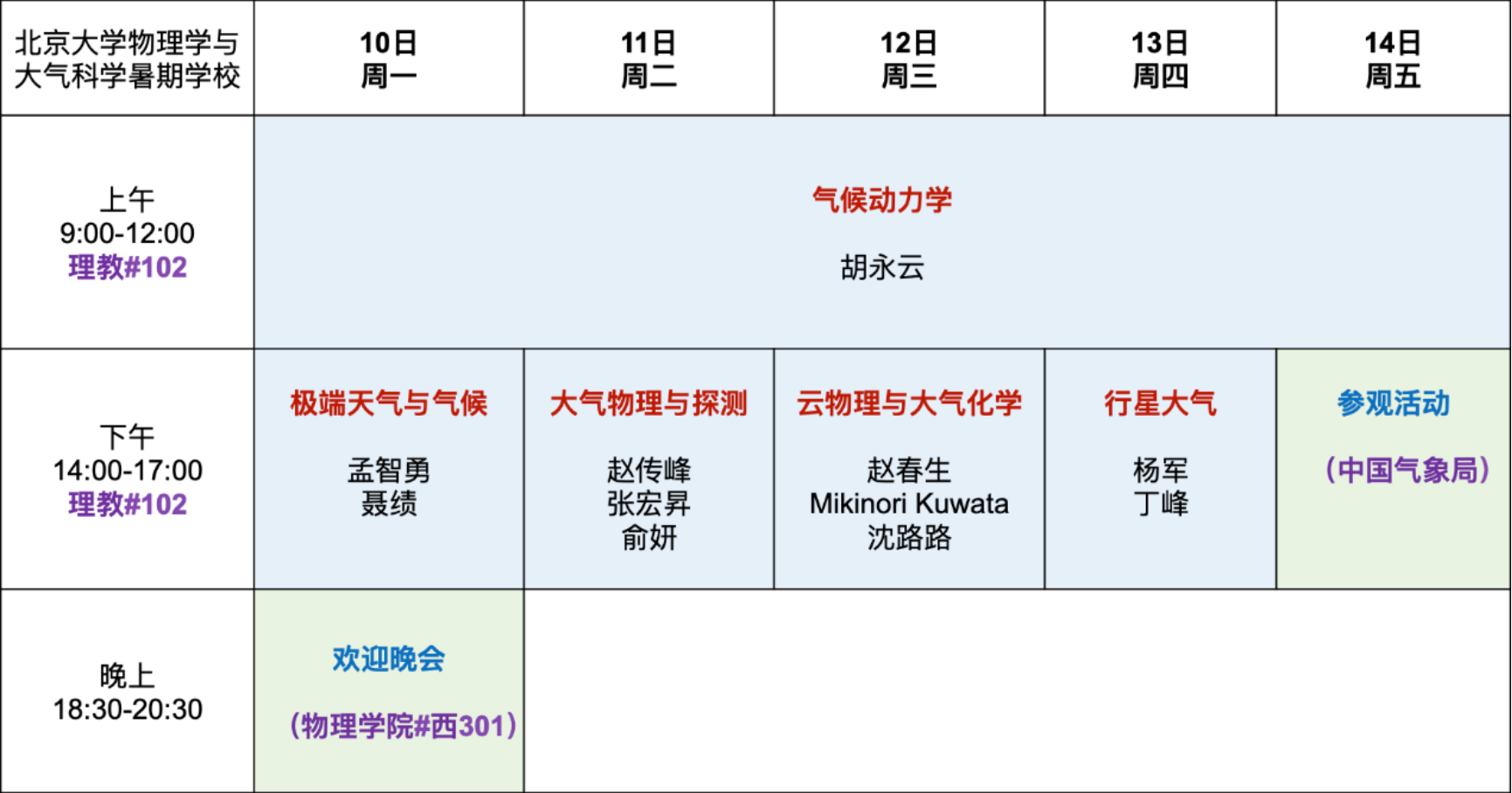 A 核心课程:由胡永云教授讲授《气候动力学》,每天上午9:00-12:00,理教102。核心课程的关键字是:深度+挑战性。希望学生通过一周的学习,了解气候变化的基本概念和重要物理过程,理解常见天气、气候现象的形成机理。