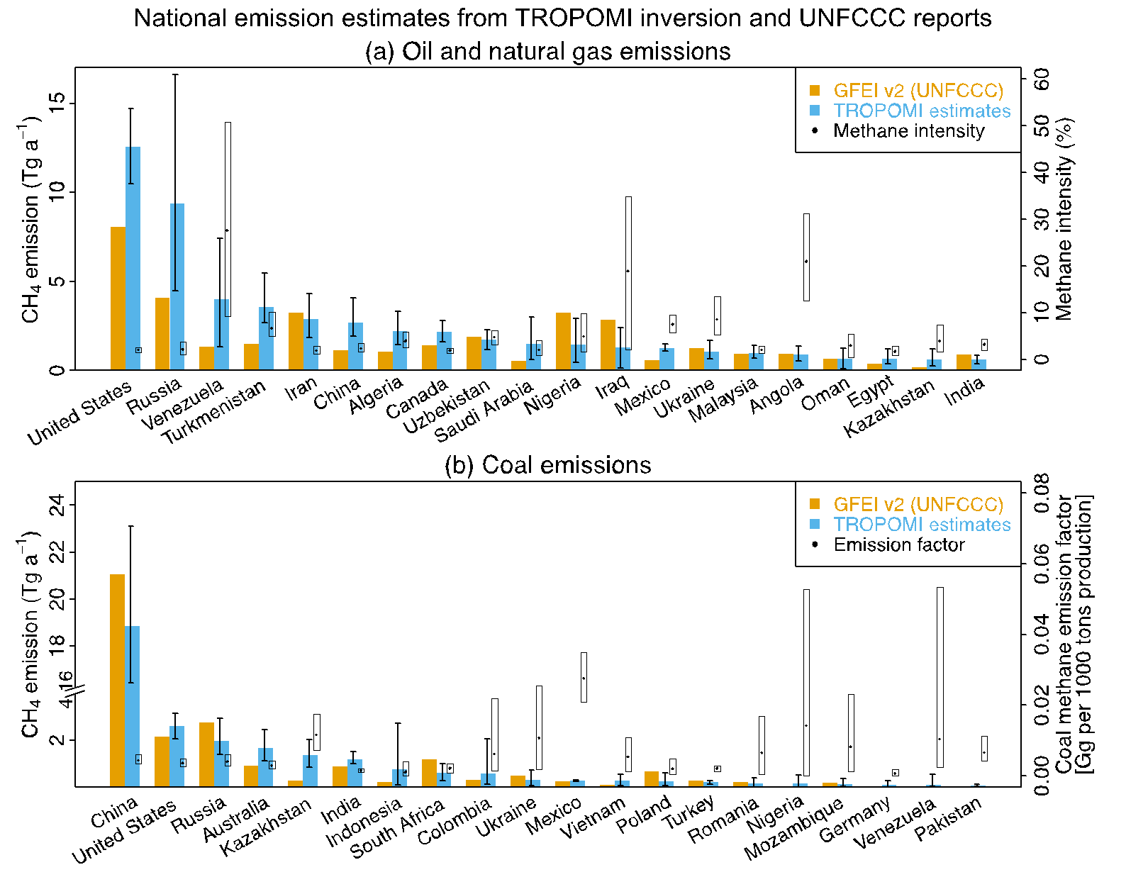 图2. 基于TROPOMI卫星反演得到的全球主要油气和煤矿开采国家的甲烷排放总量。其中,UNFCCC是目前各个国家提交给联合国的甲烷排放总量。