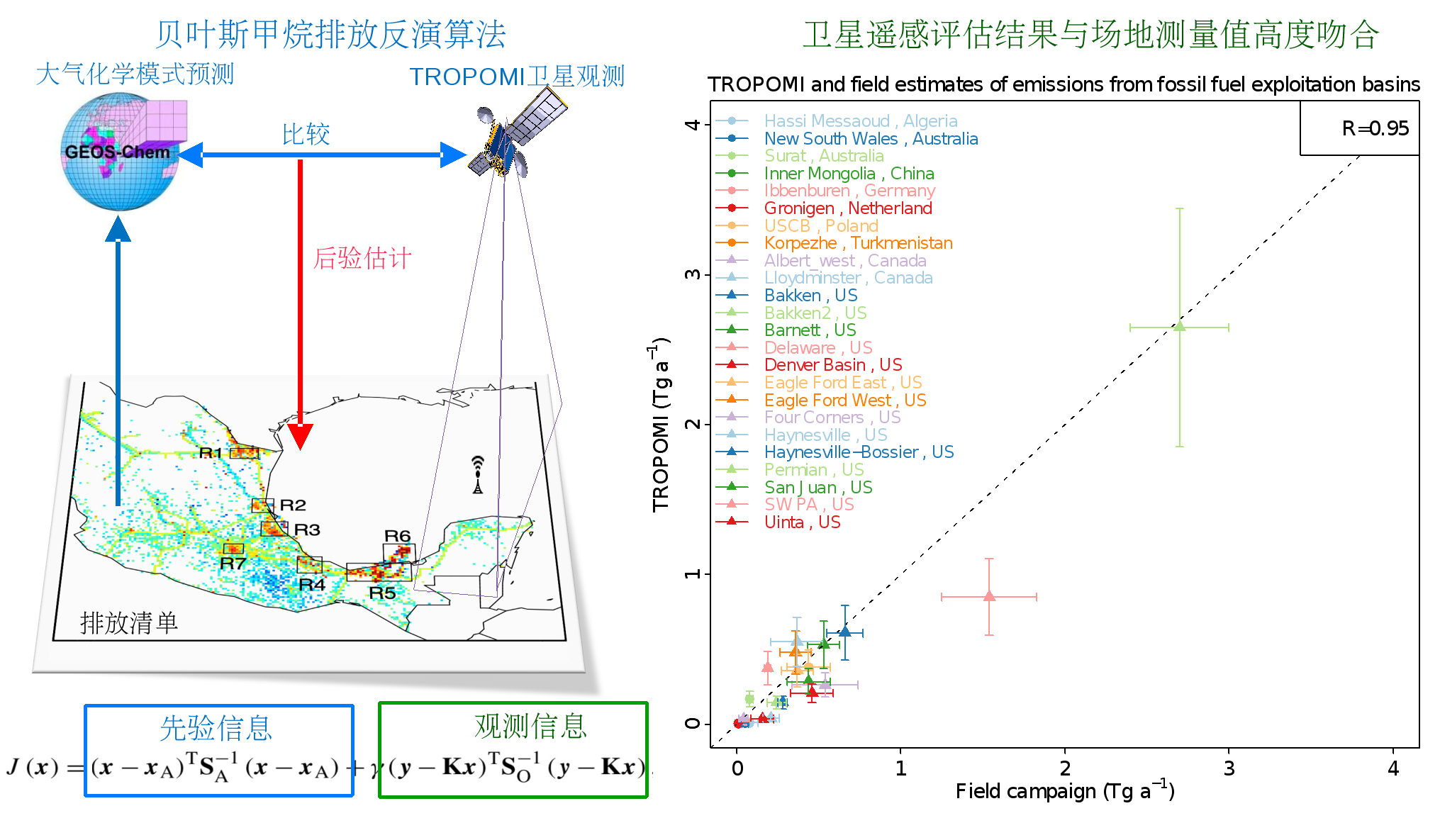 图1. (左)贝叶斯甲烷排放反演算法示意图。(右)本研究中TROPOMI卫星反演的排放强度与场地测量数据高度一致。