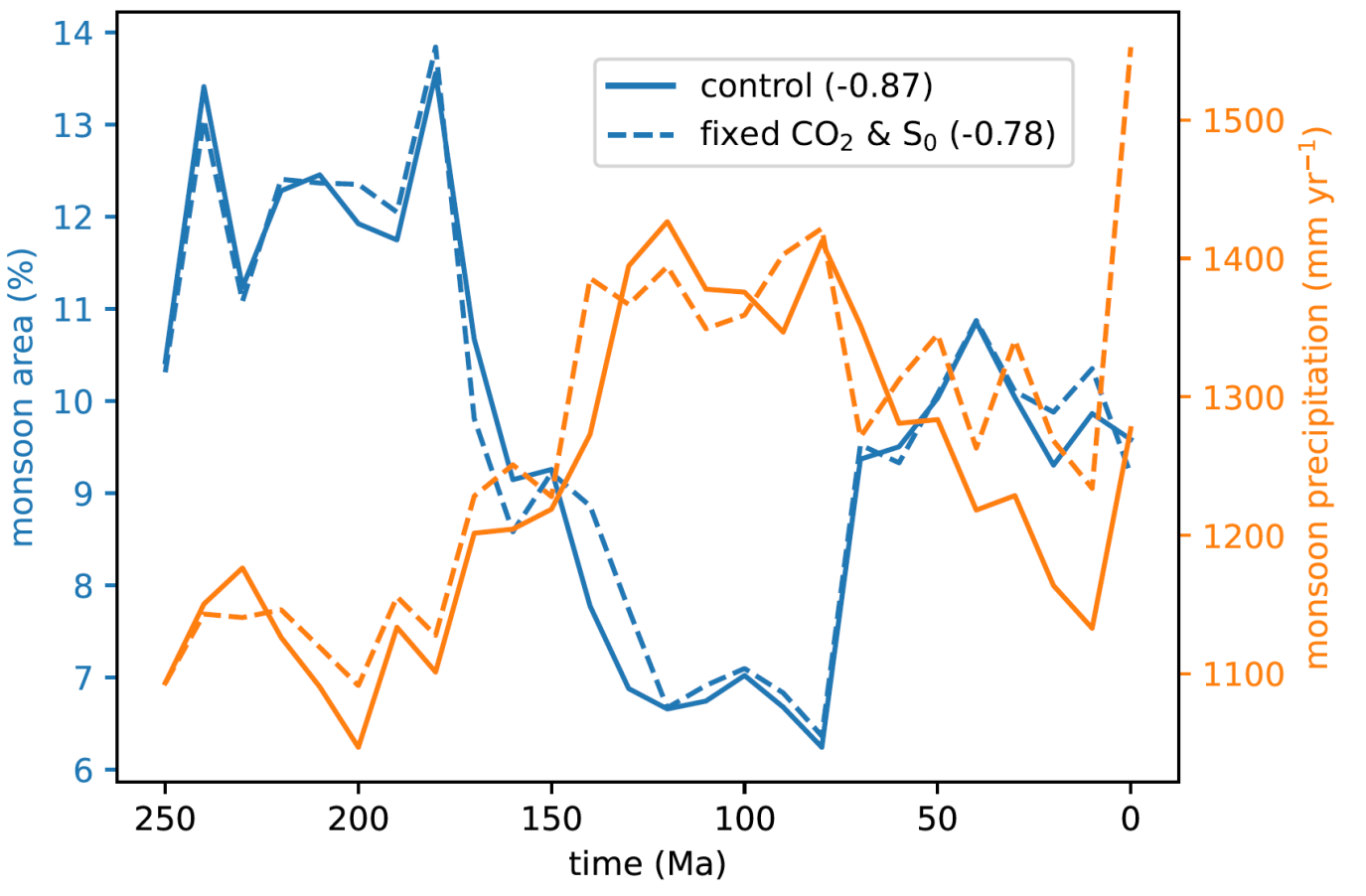 图2、过去2.5亿年全球陆地季风区面积(蓝色线)和季风降水强度(橘黄色线)的变化。左侧垂直坐标是陆地季风区面积占地球表面积的百分数,右侧垂直坐标是陆地季风区年均降水量。实线代表控制试验结果,虚线代表固定CO2浓度和太阳常数试验结果。