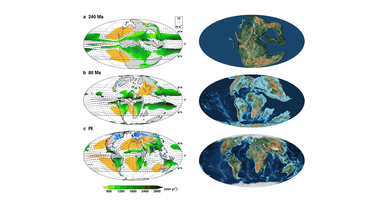使用海气耦合地球系统模式(CESM1.2.2),团队针对过去2.5亿年开展了系列气候平衡态模拟试验(每1千万年一个模拟试验),揭示出潘基亚联合大陆以来全球季风演化可划分为三个主要阶段:(1)在潘吉亚超大陆时期(图1a),全球陆地季风区面积较大(即潘吉亚“超级季风”),但季风区降水强度总体较弱;(2)到白垩纪时期(图1b),大陆裂解最充分,大陆面积由于海平面上升也达到最小,陆地季风区面积较小,但季风降水强度较大;(3)新生代期间(图1c),大陆板块重新开始汇聚,且面积增大,陆地季风区面积变大,但季风降水强度减弱。
