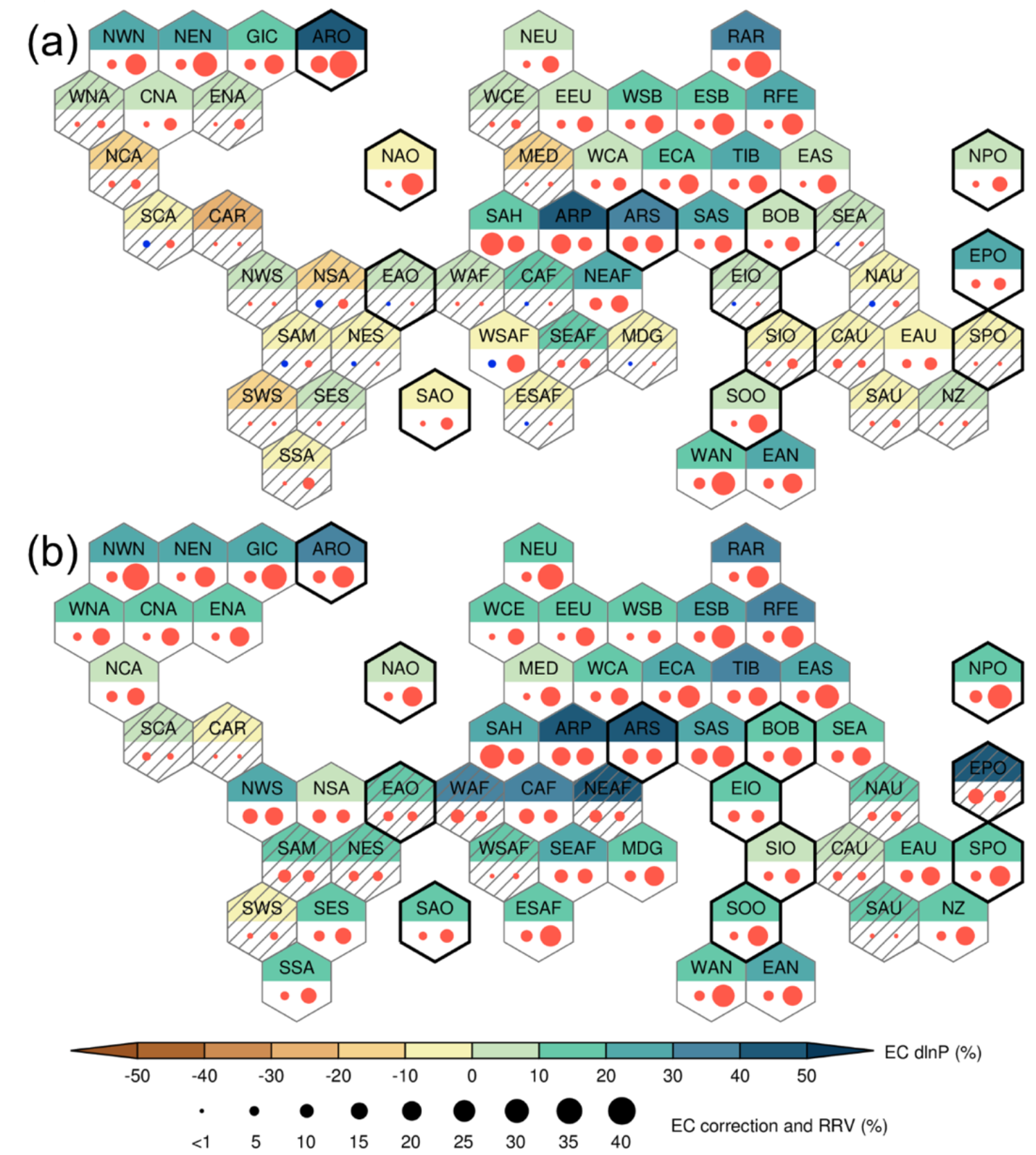 图1: 经过约束修正,高排放情景下本世纪末全球各区域(a)平均降水和(b)极端降水的气候预测。各区域分别用六边形分别表示,六边形上方为区域名称缩写,填色为降水的相对变化(数值对应色标);下方左圆点对应约束对多模式集合平均值的减小,右圆点对应对模式不确定性的减小(数值对应圆点大小)。