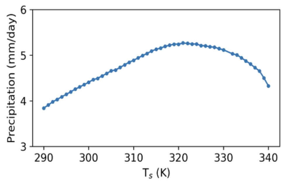 图 1.三维大气环流模式模拟的全球平均地表降水量随平均地表温度的变化。全球平均降水是平均地表温度的非单调函数,在极热气候下会随着气候变暖而减少。