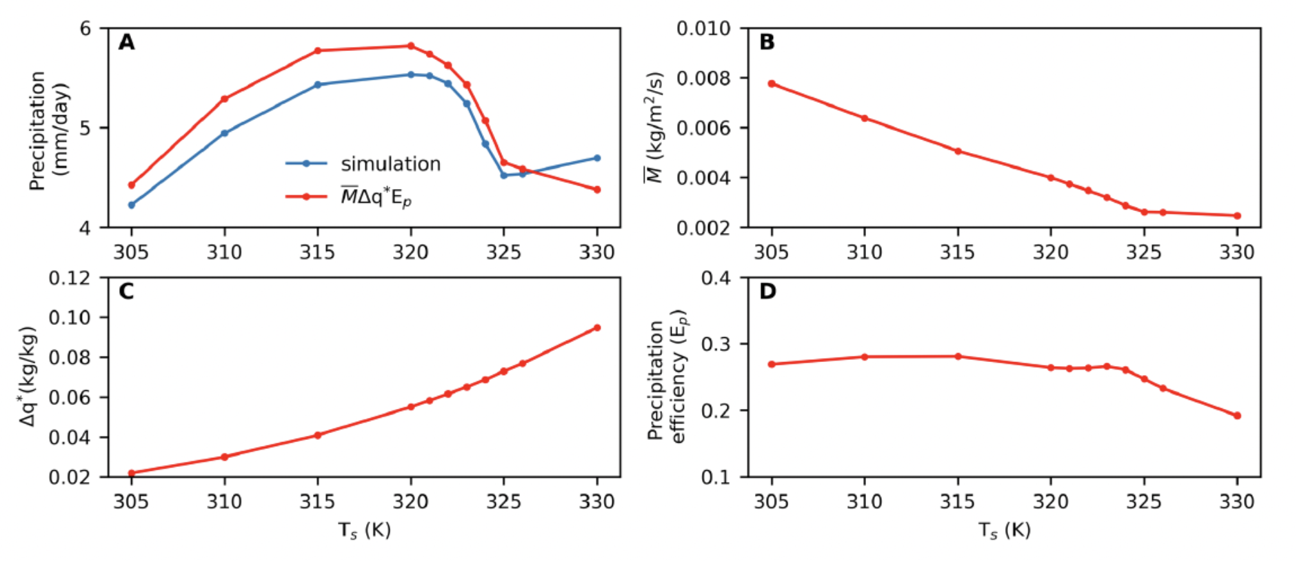 图 4.全球平均降水量的动力约束。(A)模式模拟的平均降水(蓝线)和基于动力约束的估计平均降水(红线)随地表温度的变化。(B)垂直平均的对流质量通量随地表温度的变化。(C)云底与云顶的水汽绝对湿度差随地表温度的变化。(D)降水效率随地表温度的变化。极热气候下平均降水量减弱主要是由于对流质量通量的减少。