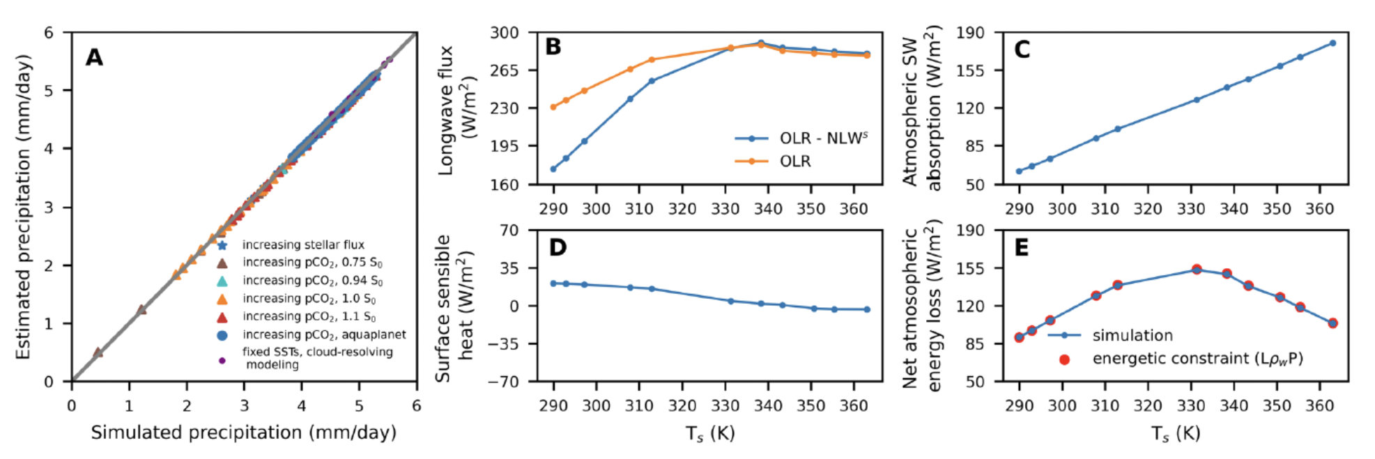 从能量平衡的角度,全球平均降水受到大气能量收支的约束(图3A)。大气通过吸收来自恒星的短波辐射(图3C)、地表的潜热(图3E)和感热(图3D)获得的能量,要与大气向外发射的长波辐射(图3B)平衡。而全球平均降水与地表释放的潜热基本成正比关系,所以全球平均地表降水是受地球大气的能量收支来控制的。其中起主导作用的是大气向外发射的长波辐射(图3B)和大气吸收的短波辐射(图3C)。当地表温度较低时,大气向外发射的长波辐射比吸收的短波辐射随气候变暖增长得更快,所以地表可以释放的潜热随气候变暖而增加,全球平均降水也随气候变暖而增加。然而进入极热气候后,大气会变得非常湿润,水汽几乎可以吸收掉所有地表和大气低层辐射出的长波辐射。在这种情况下,当地表温度持续增加,大气无法增加向外的长波辐射;但由于水汽对近红外波段太阳光的吸收,大气的短波吸收仍然会持续增加,此时根据能量平衡,地表释放的潜热就减少了,全球平均降水也减少了(图3E)。