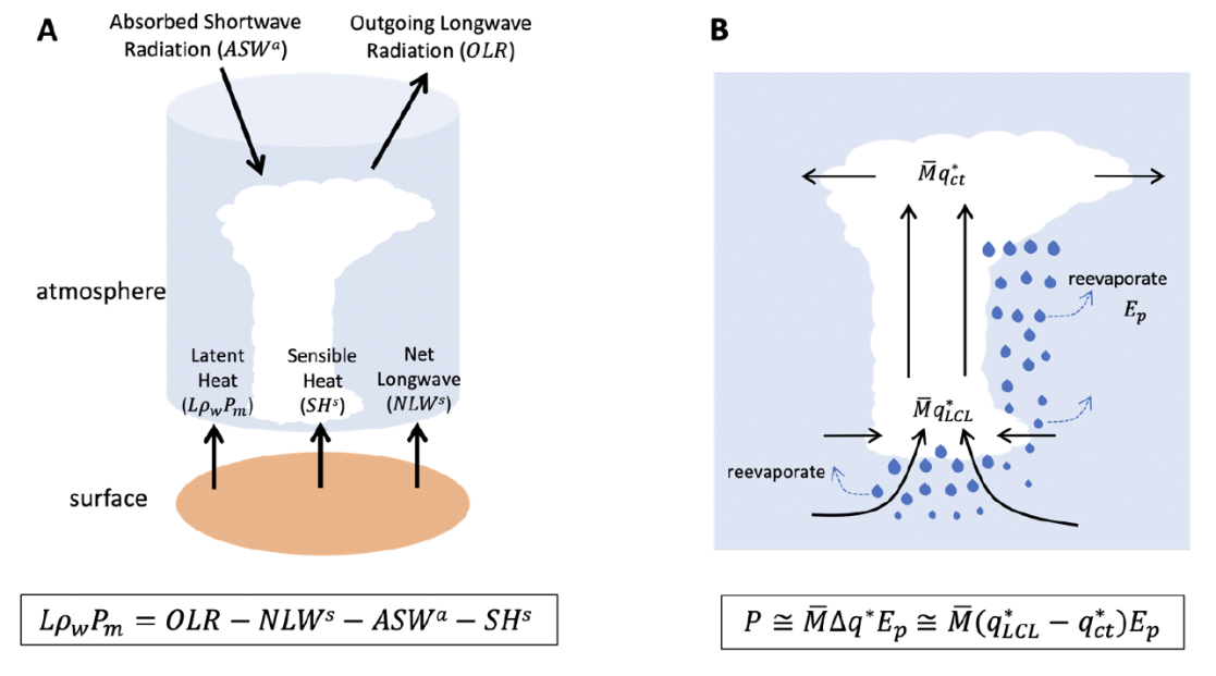 图 2.全球平均降水的能量约束(A)和动力约束(B)示意图。 在能量约束下,全球平均降水强度由大气净能量损失决定。在动力约束下,全球平均降水强度主要由对流质量通量、云底和云顶之间的水汽绝对湿度差以及降水效率决定。