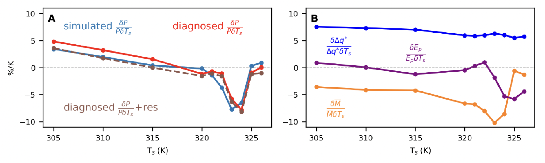 图 5.能量约束中平均降水随地表温度的相对变化量和每个变量的贡献。(A) 模式模拟的平均降水随地表温度的相对变化(蓝色),通过能量约束估计的平均降水随地表温度的相对变化(红色)。(B) 能量约束中各变量对降水变化的贡献,垂直平均的对流质量通量(橙色)、云底与云顶的饱和水汽绝对湿度差(深蓝色)和 降水效率(紫色)。