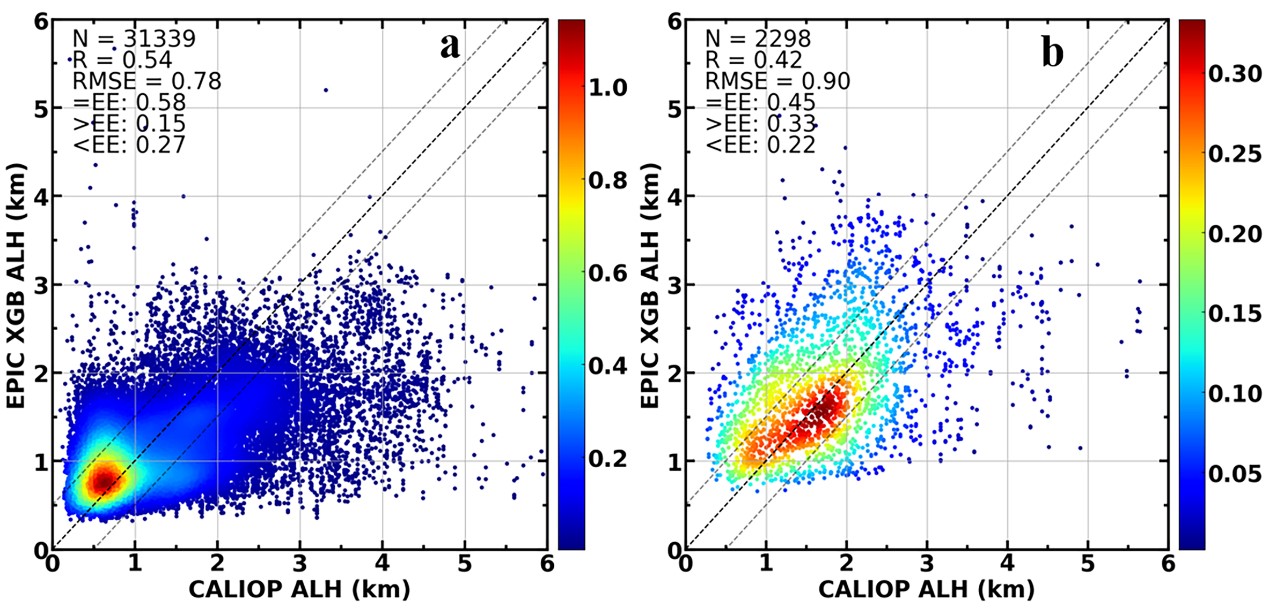 图1 EPIC XGB ALH和CALIOP ALH检验结果的散点密度图(a为区域1;b为区域2)