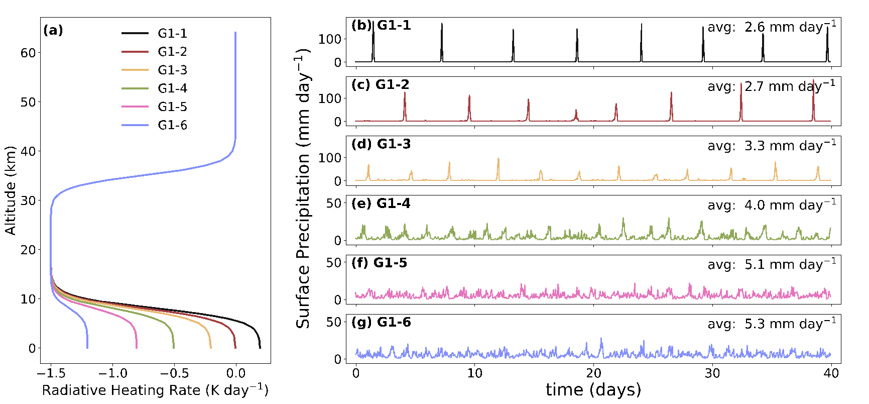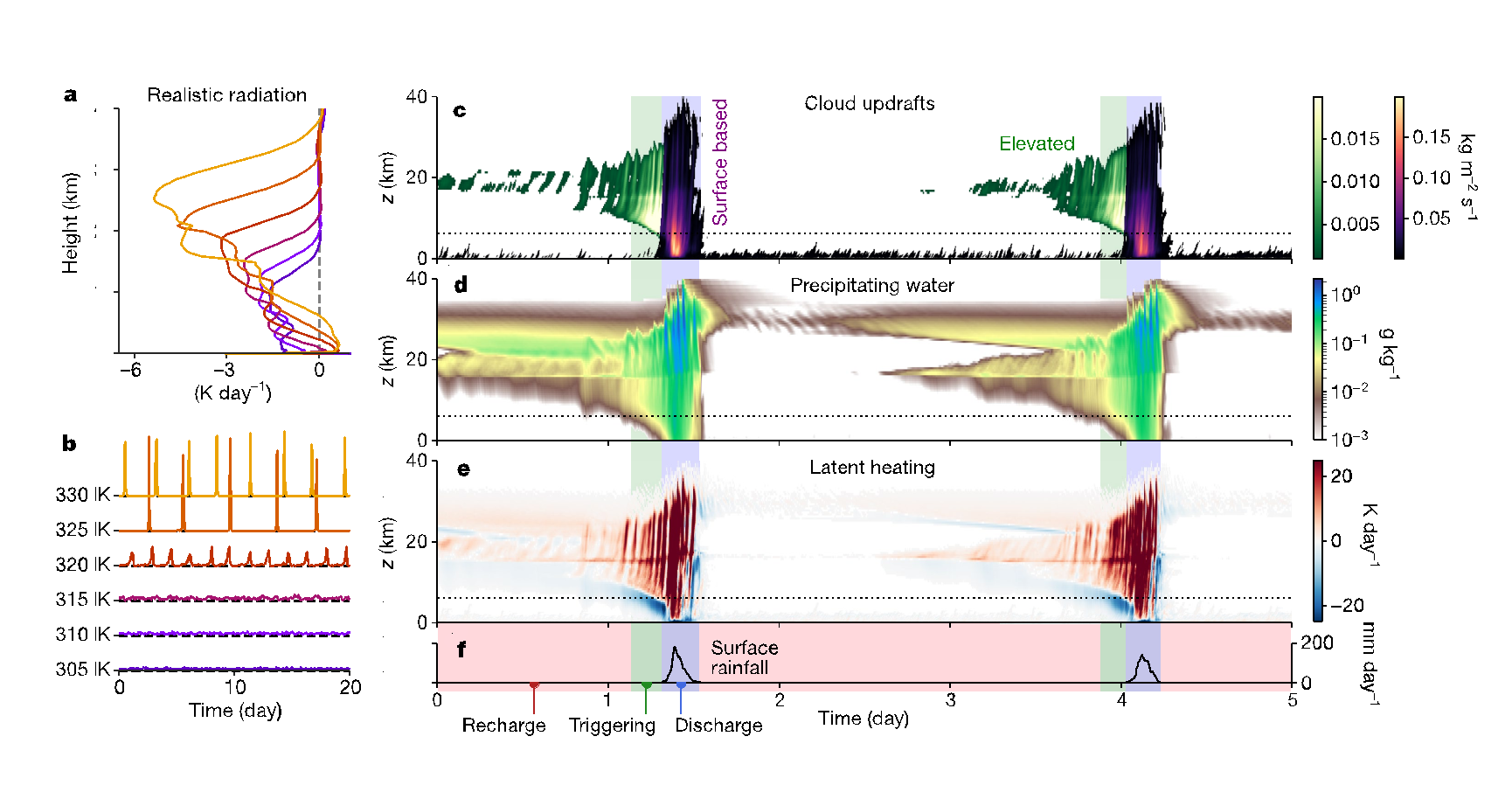 图1. a, b: 不同地表温度下的辐射加热率廓线以及地表降水序列。e-f: 前人提出的间歇性暴雨机制。地表温度为325 K的时间-高度二维模拟结果,包括上升气流(c)、大气降水(d)、潜热释放(e)和地表降水(f)。图片引自Seeley and Wordsworth, Nature 2021.