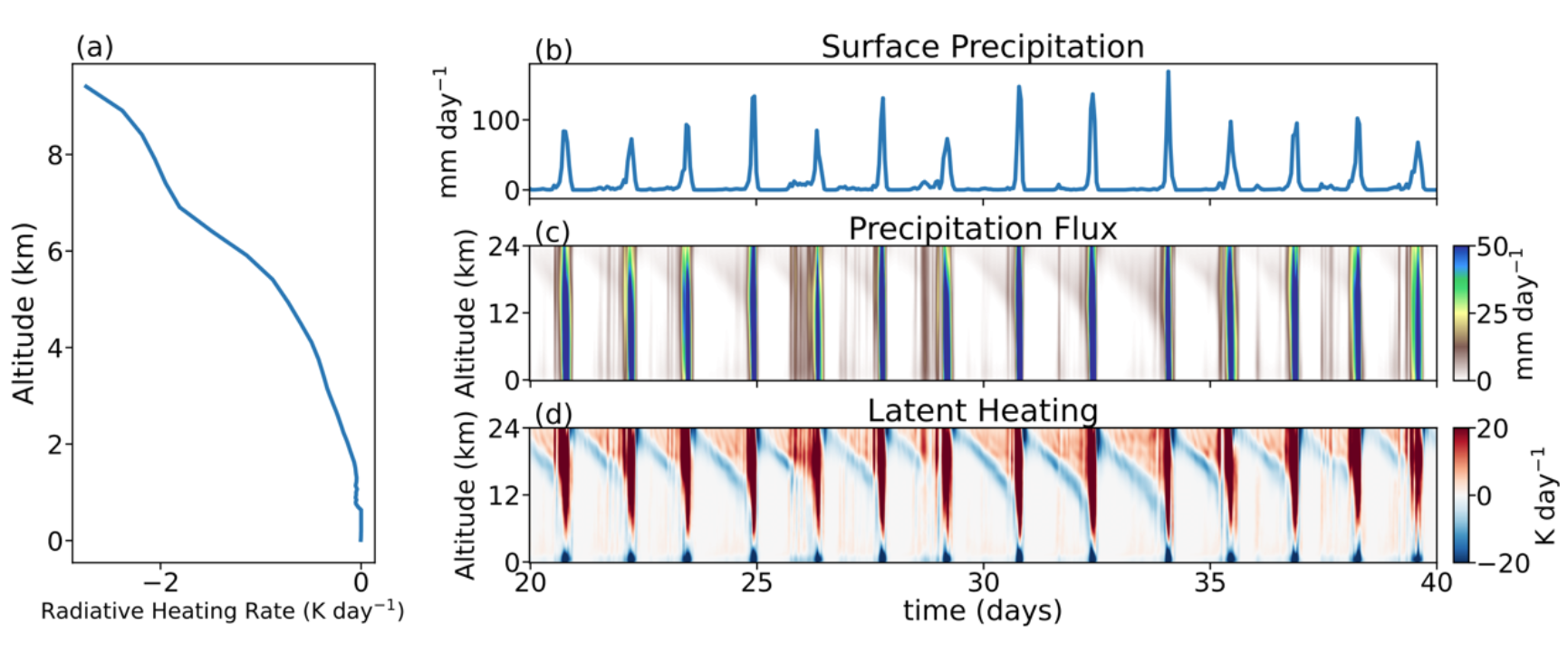 图2. 极夜模拟下的加热率廓线(a), 地表降水(b), 降水通量(c)和潜热释放(d)。极夜情况下,即使没有短波辐射过程,没有对流层低层辐射加热,间歇性暴雨依旧发生。