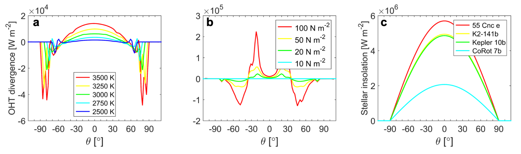 图3. 不同表面温度强迫下的海洋热量输送净通量(a), 不同风应力强迫下的海洋热量输送净通量(b),和不同潮汐锁定熔岩行星接收的恒星辐射(c)。