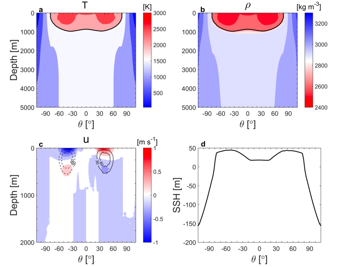 本研究开发了一个二维的理想海洋模式,以探讨在内部能量极弱或缺乏情况下的海洋环流及海洋深度。我们的模式考虑了从固相点(1700 K)到液相点(2000 K)的密度跃变,并考虑了硅酸盐黏性随温度与熔化程度的变化。值得注意的是,我们在固态区域(温度低于1700 K处)使用了较大的黏性,以使其速度接近零。我们的海洋模式并未与大气耦合,而是通过表面温度和风应力强迫来模拟大气的影响。参考熔岩行星Kepler-10b的参数,我们设置星下点的温度为3000 K,夜侧温度为50 K,风应力的极值达到了约100 N/m2。