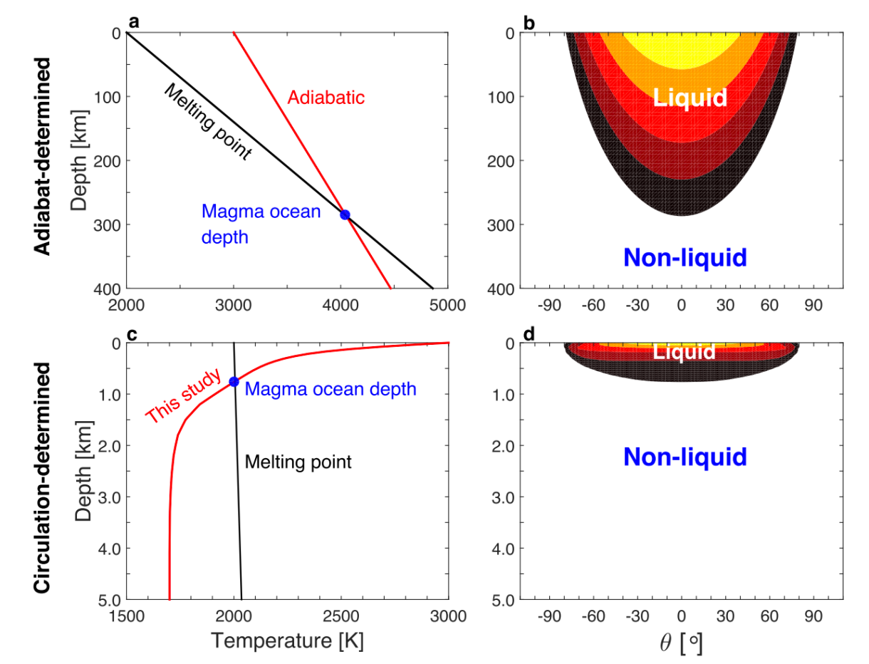 图1. a,b 内部能量驱动的对流主导时的温度廓线和海洋深度。c,d 恒星辐射驱动的海洋环流主导时的温度廓线和海洋深度。