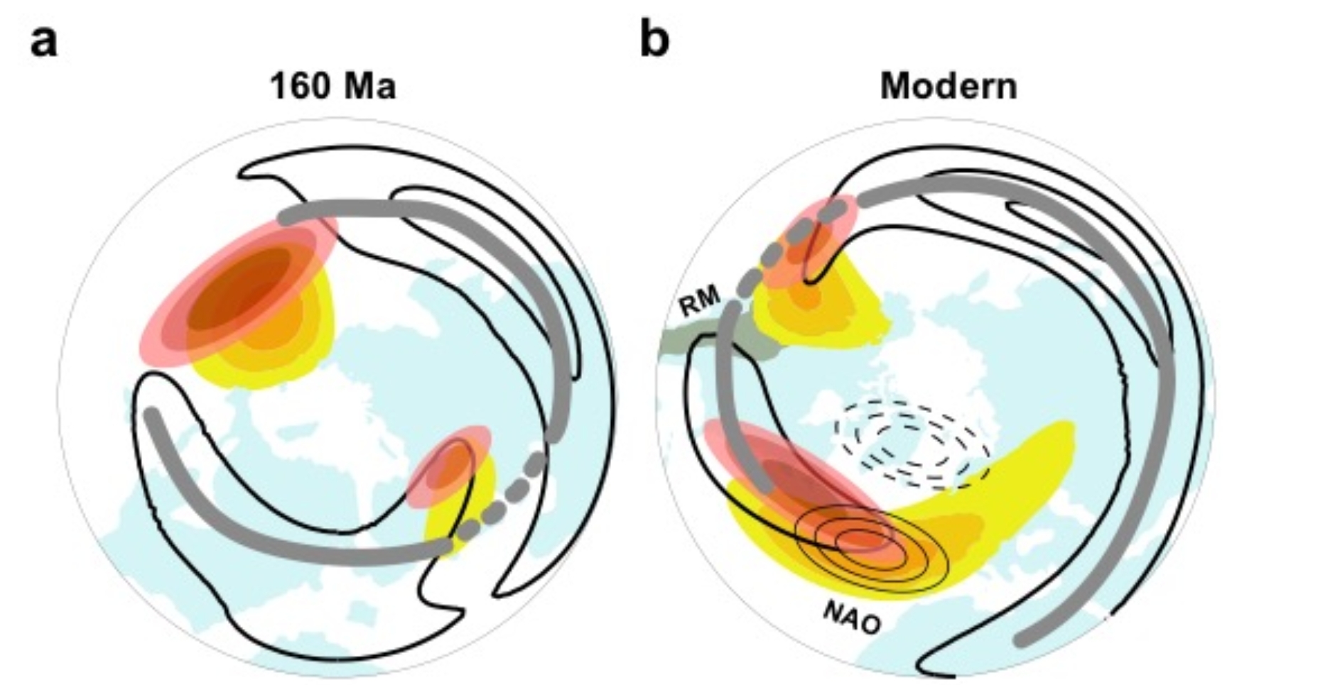 图2:北半球大气环流特征示意图:(a) 北大西洋裂解前(160 Ma) 和 (b) 现代。粗黑实线 表示对流层西风急流区;黄色区域 表示定常高压;红色区域 表示风暴轴;灰色线表示大气波动能量的传播和耗散(虚线)。图 (b)中 细黑实线和虚线表示 NAO 的南北偶极子结构,灰色阴影(RM)表示落基山脉。