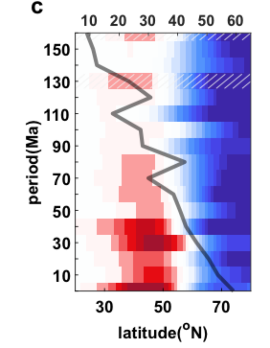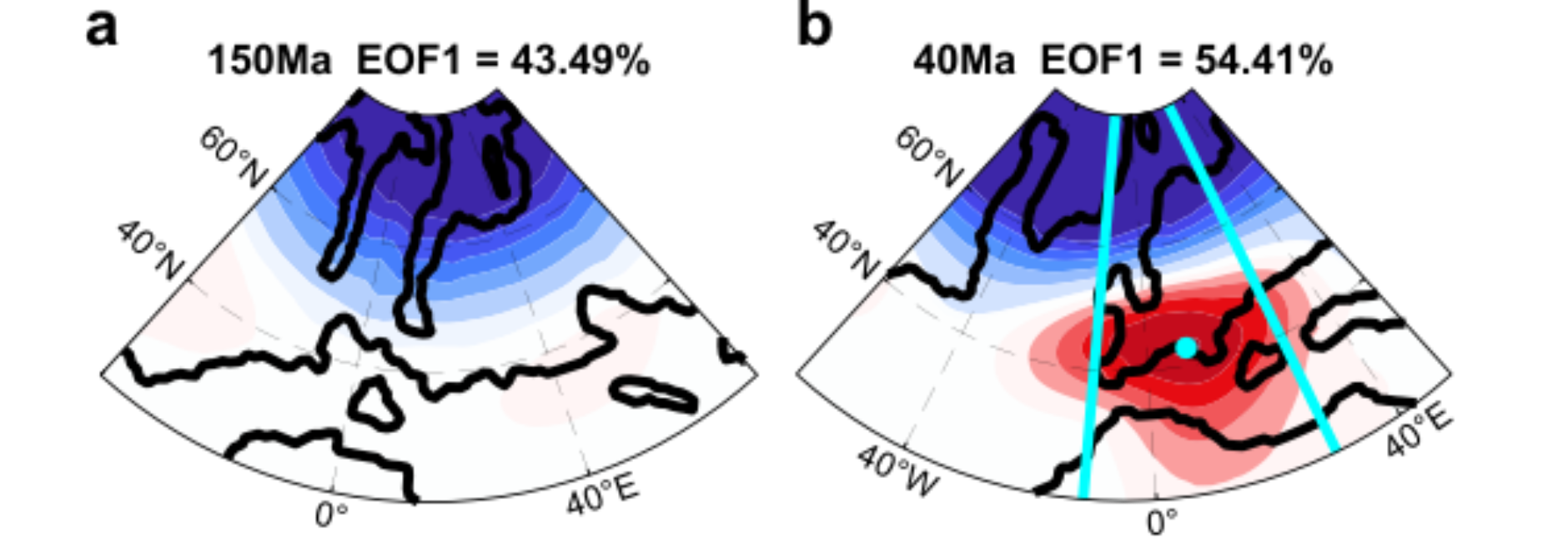 图1:北大西洋气候模态演变。(a) 150Ma时期的结果,无NAO,(b) 40Ma时期的结果,类似现代的NAO,表现为中纬度和极地气压的反相位变化(红色和蓝色),(c) NAO的地质时期演化。纵轴为时间,下横轴为纬度。红色和蓝色表征北大西洋地区气候模态的纬向平均,颜色越深代表南北偶极子越强,越接近现代NAO。灰色粗实线是北大西洋的平均宽度,对应上横轴。图中显示自160Ma以来,NAO于80Ma至60Ma出现,并不断加强。